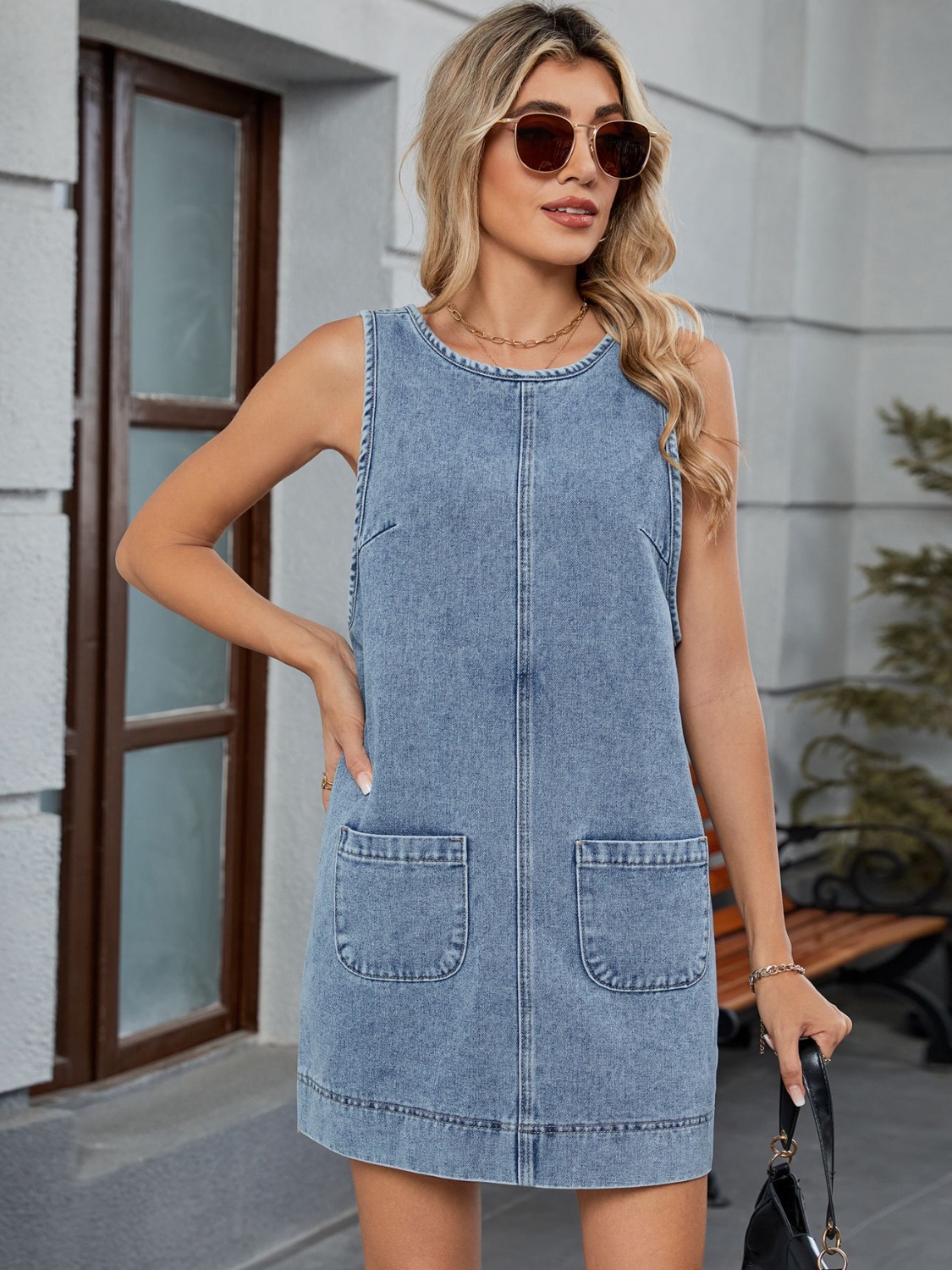 Round Neck Denim Overall Dress
