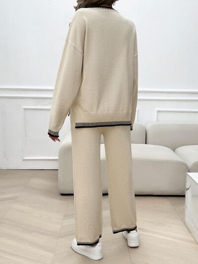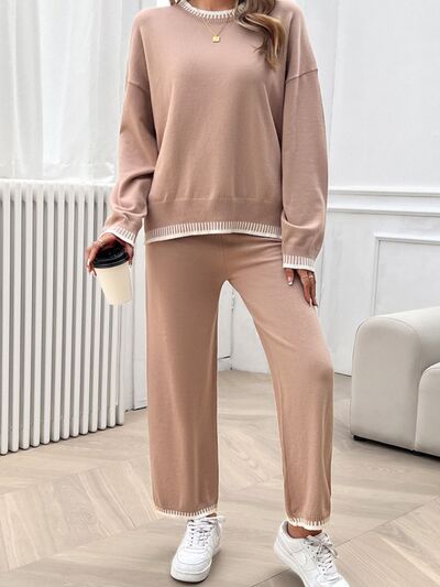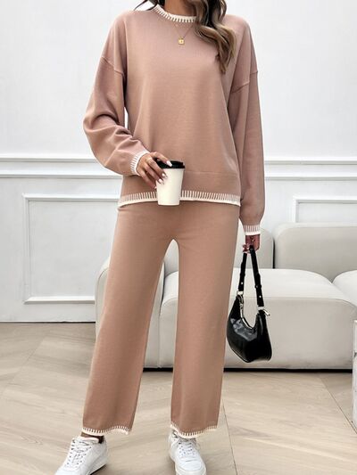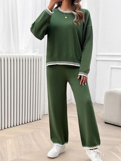 Round Neck Dropped Shoulder Top and Pants Sweater Set