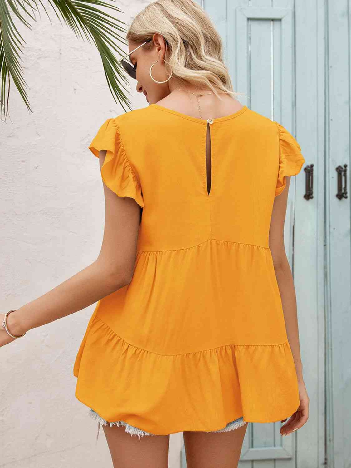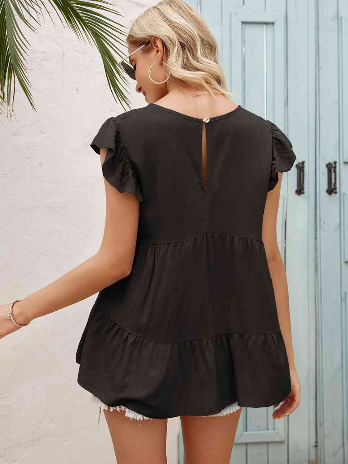 Round Neck Flutter Sleeve Tiered Blouse