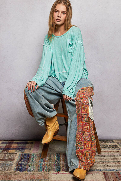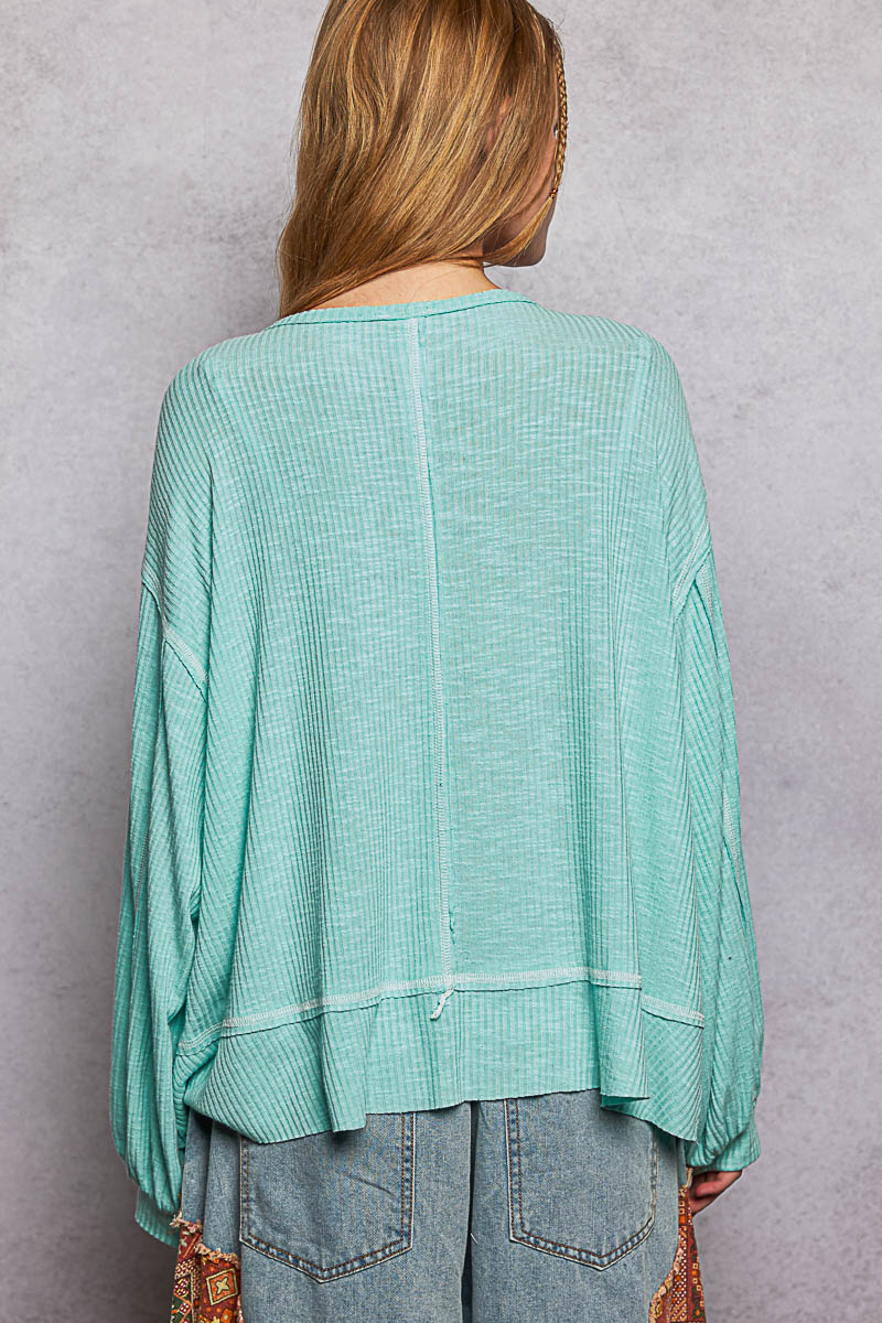 Round Neck Long Sleeve Exposed Seam Top with Chest Pocket