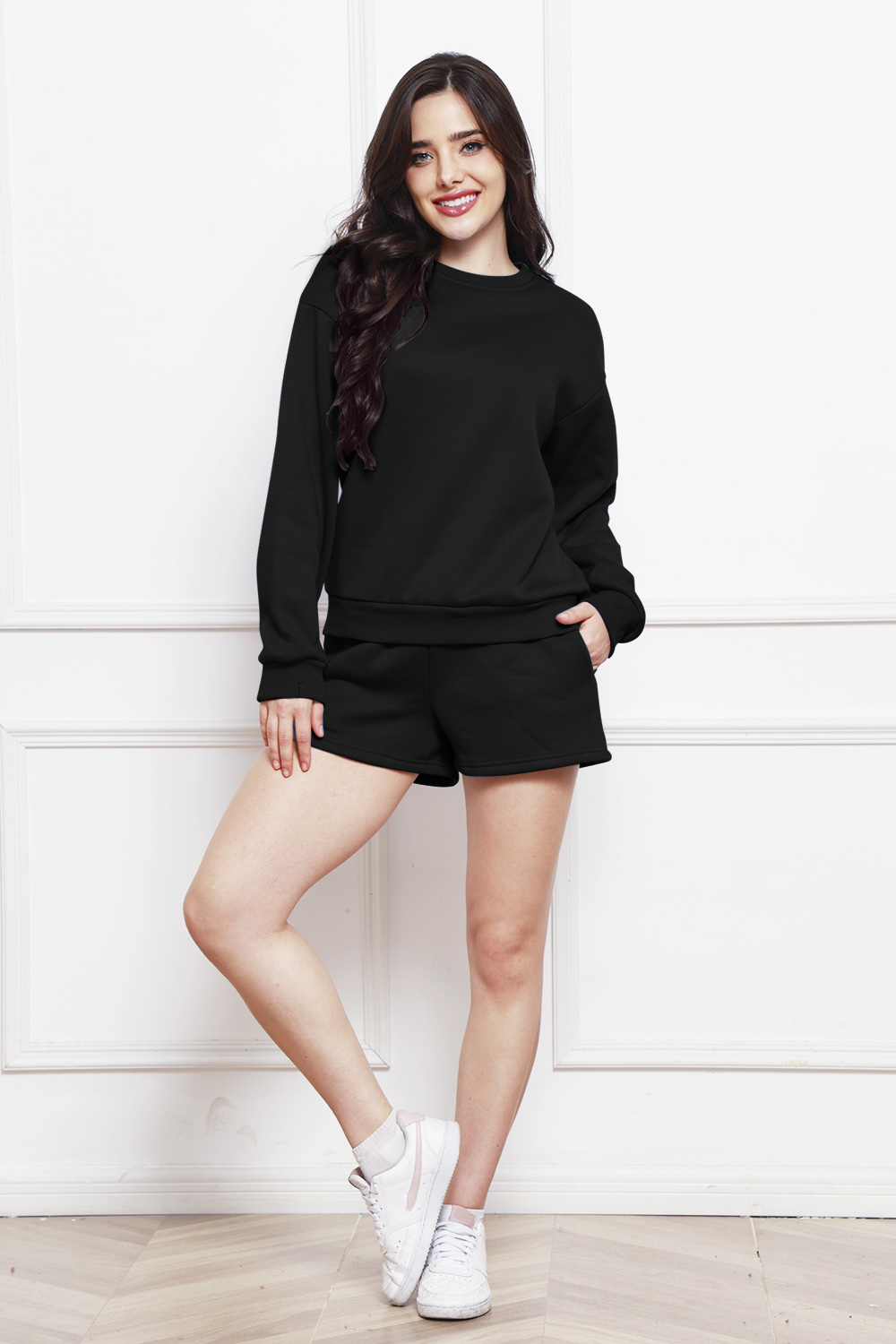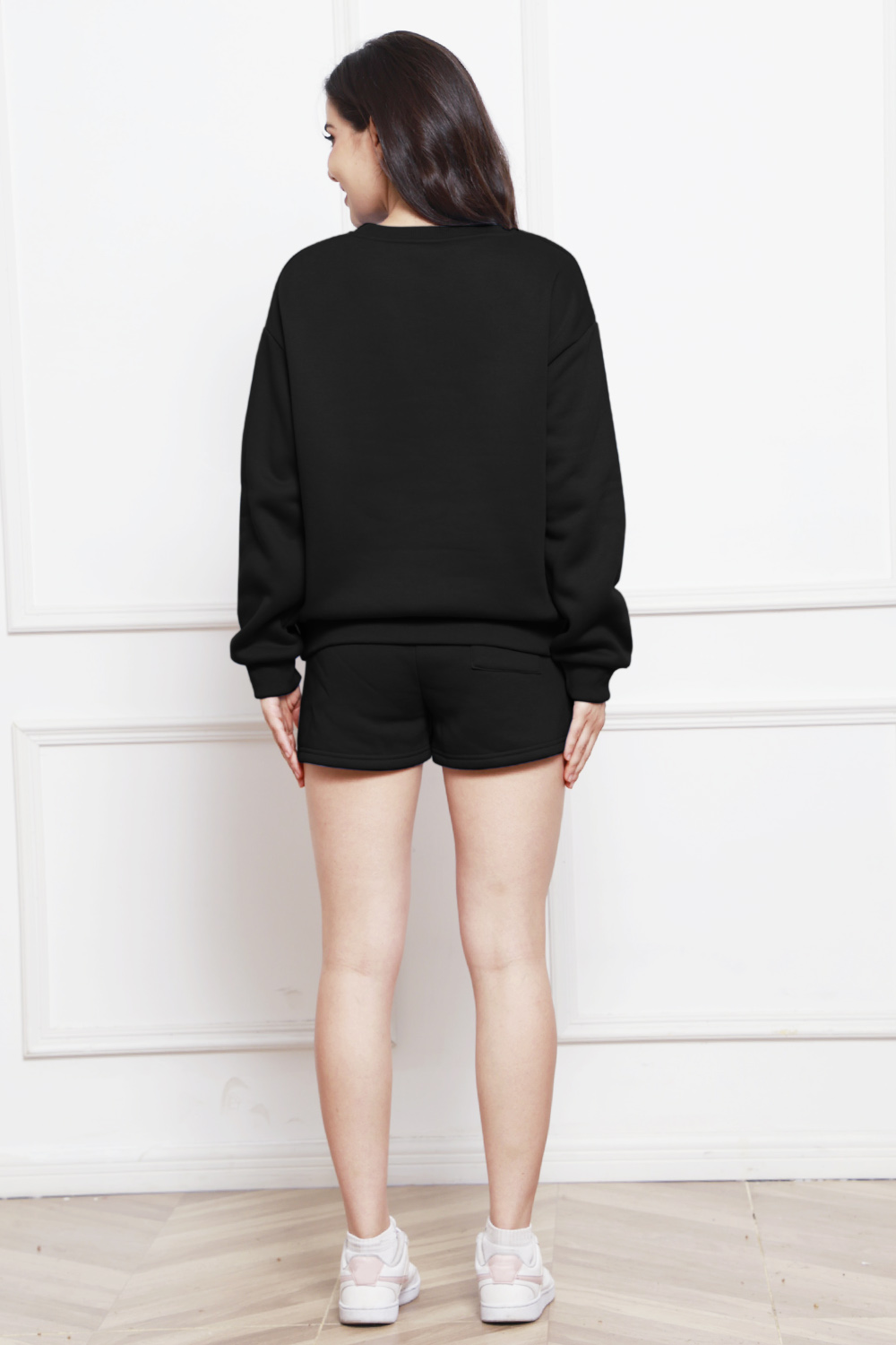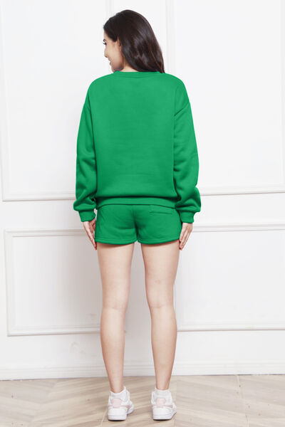 Round Neck Long Sleeve Sweatshirt and Drawstring Shorts Set