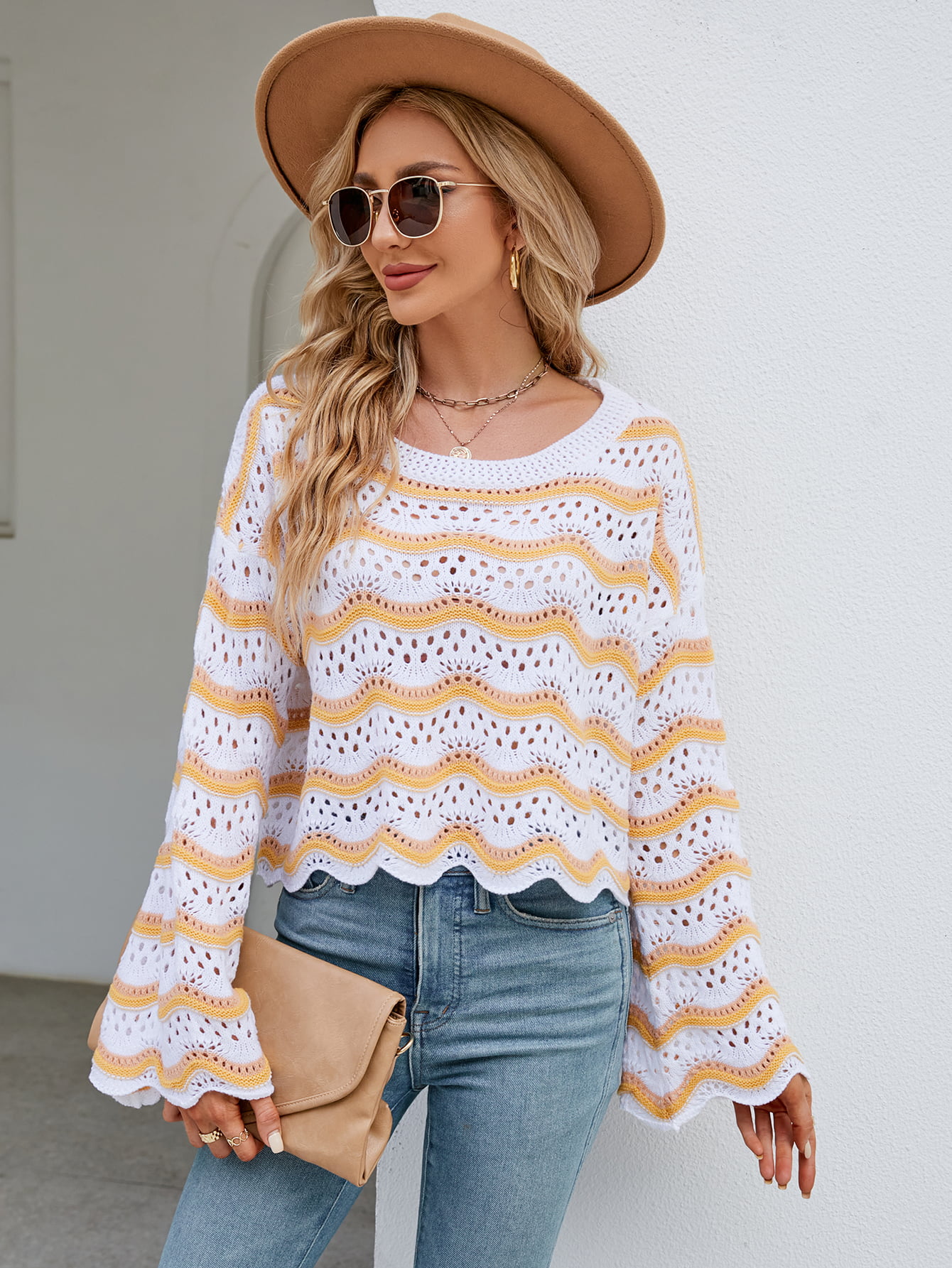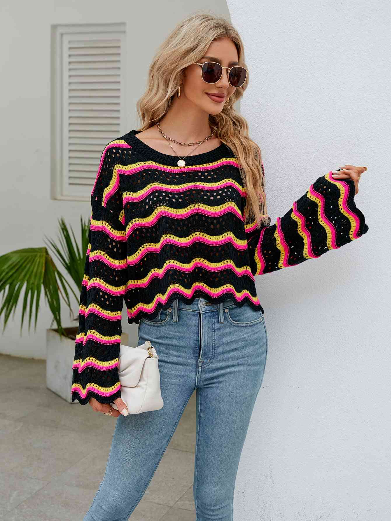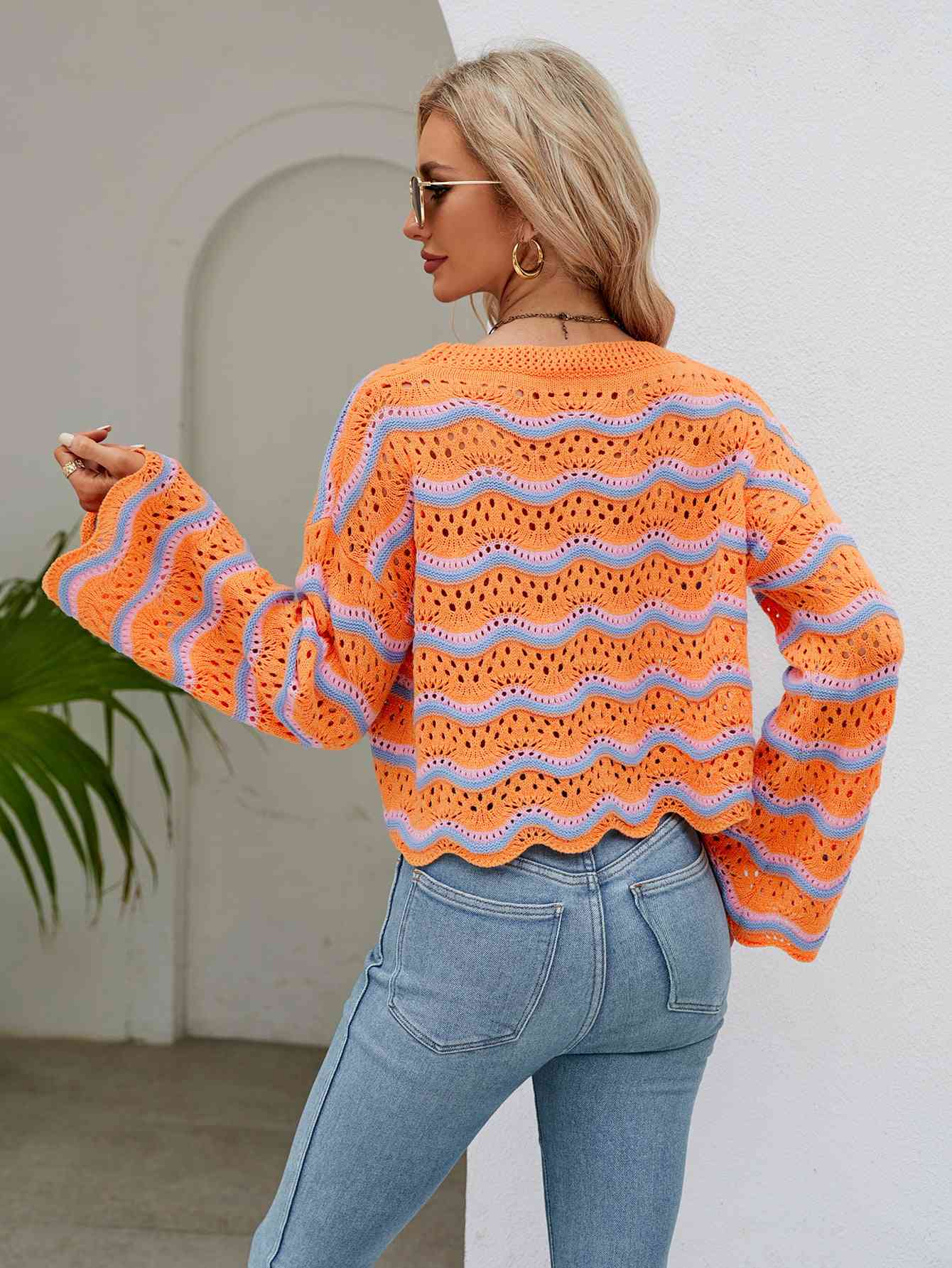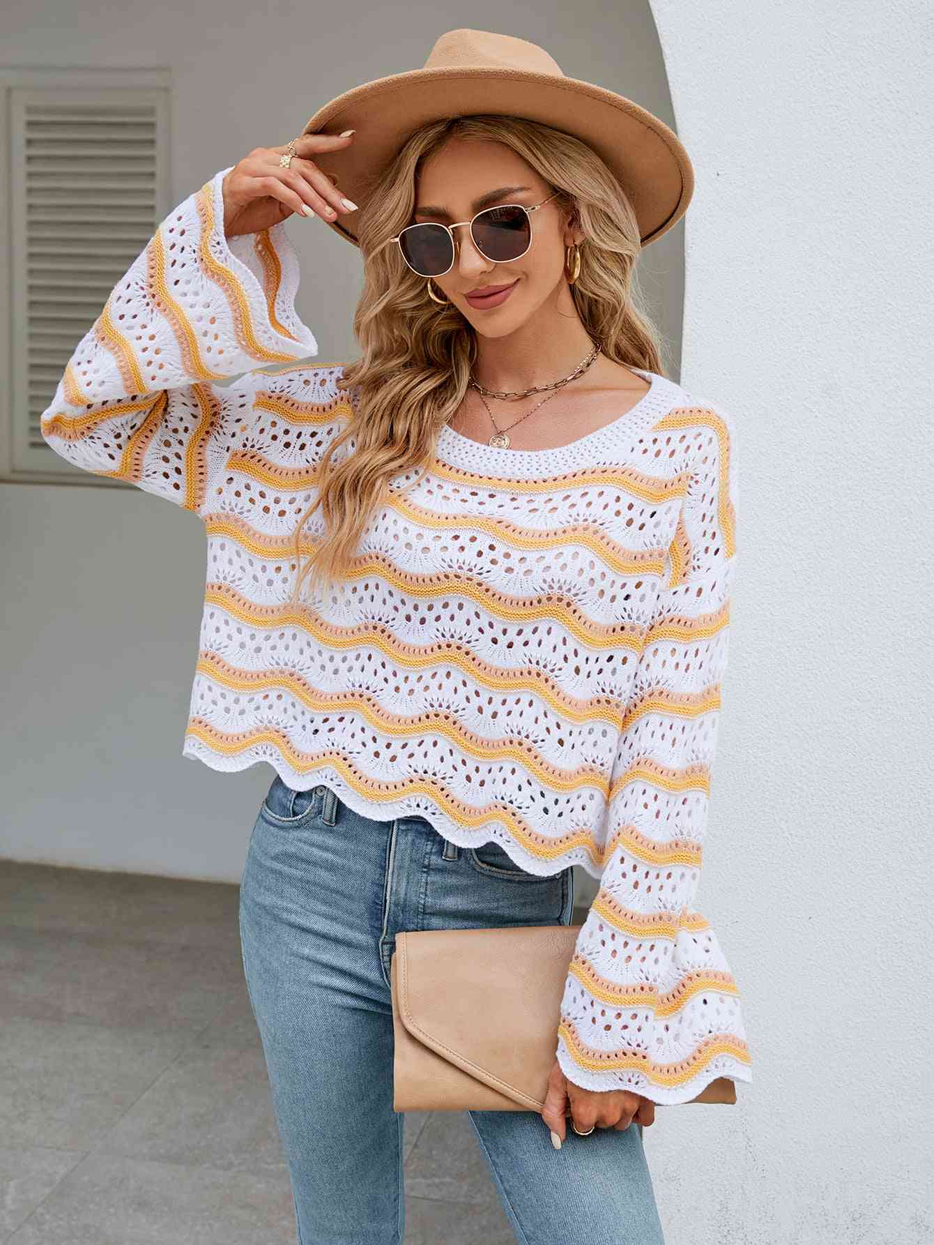 Round Neck Openwork Flare Sleeve Knit Top