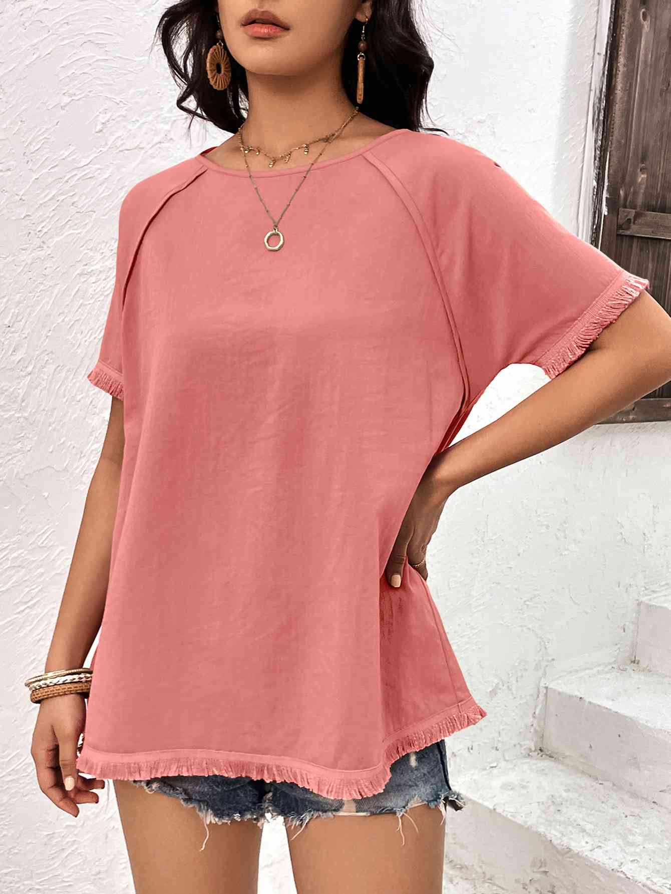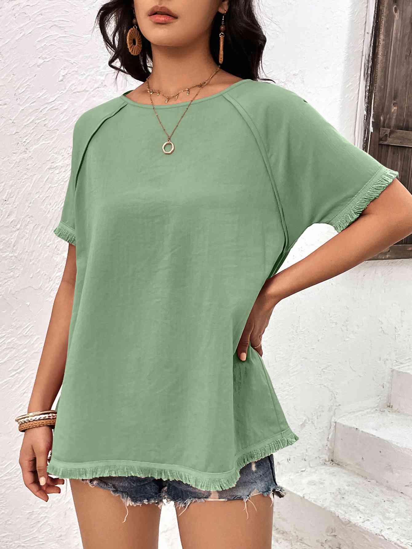 Round Neck Raglan Sleeve Fringe Detail Top