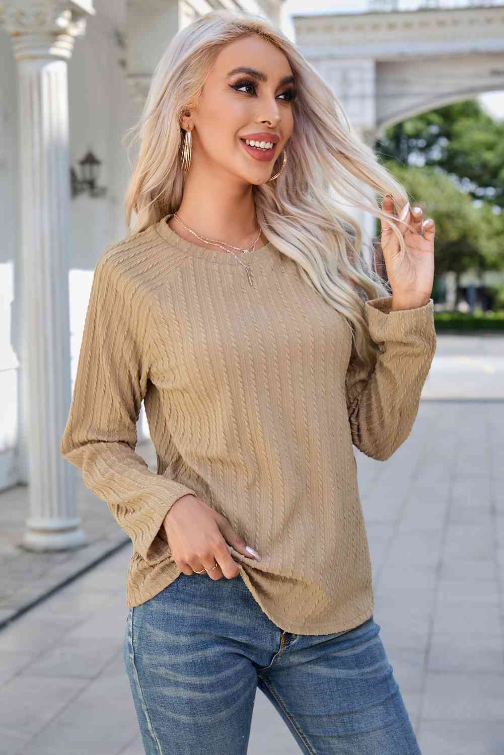 Round Neck Raglan Sleeve Ribbed Blouse