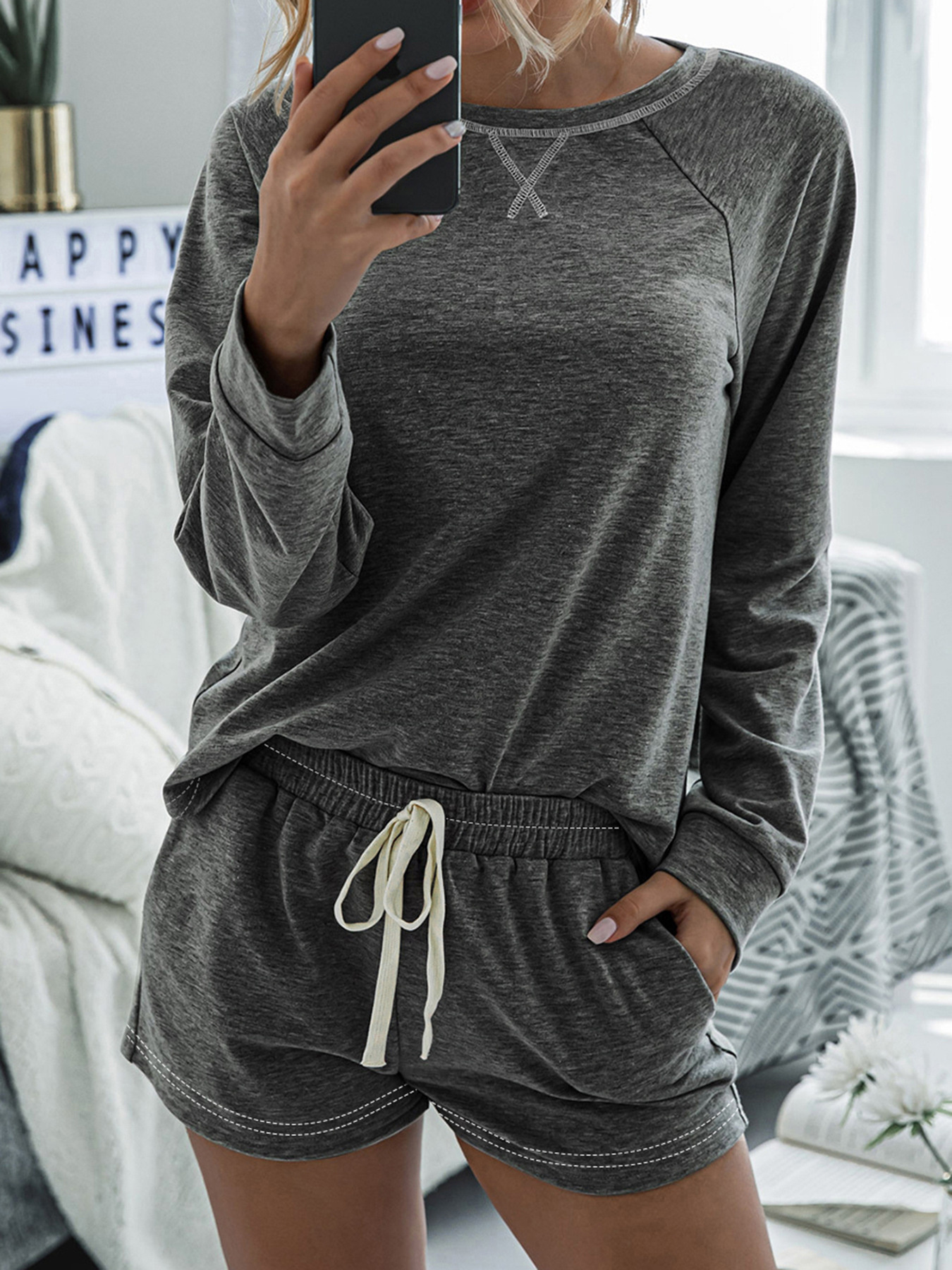Round Neck Raglan Sleeve Top and Shorts Lounge Set