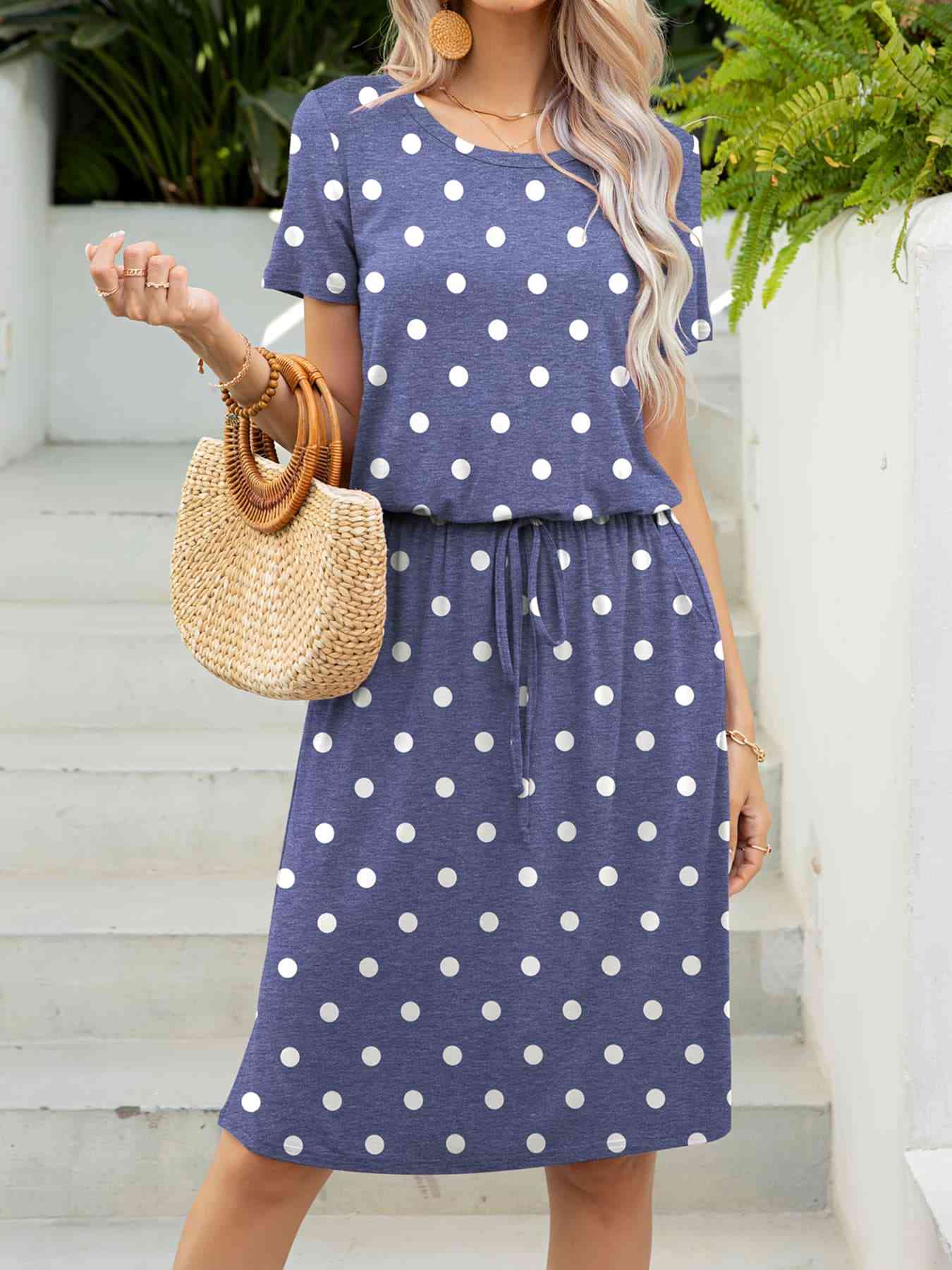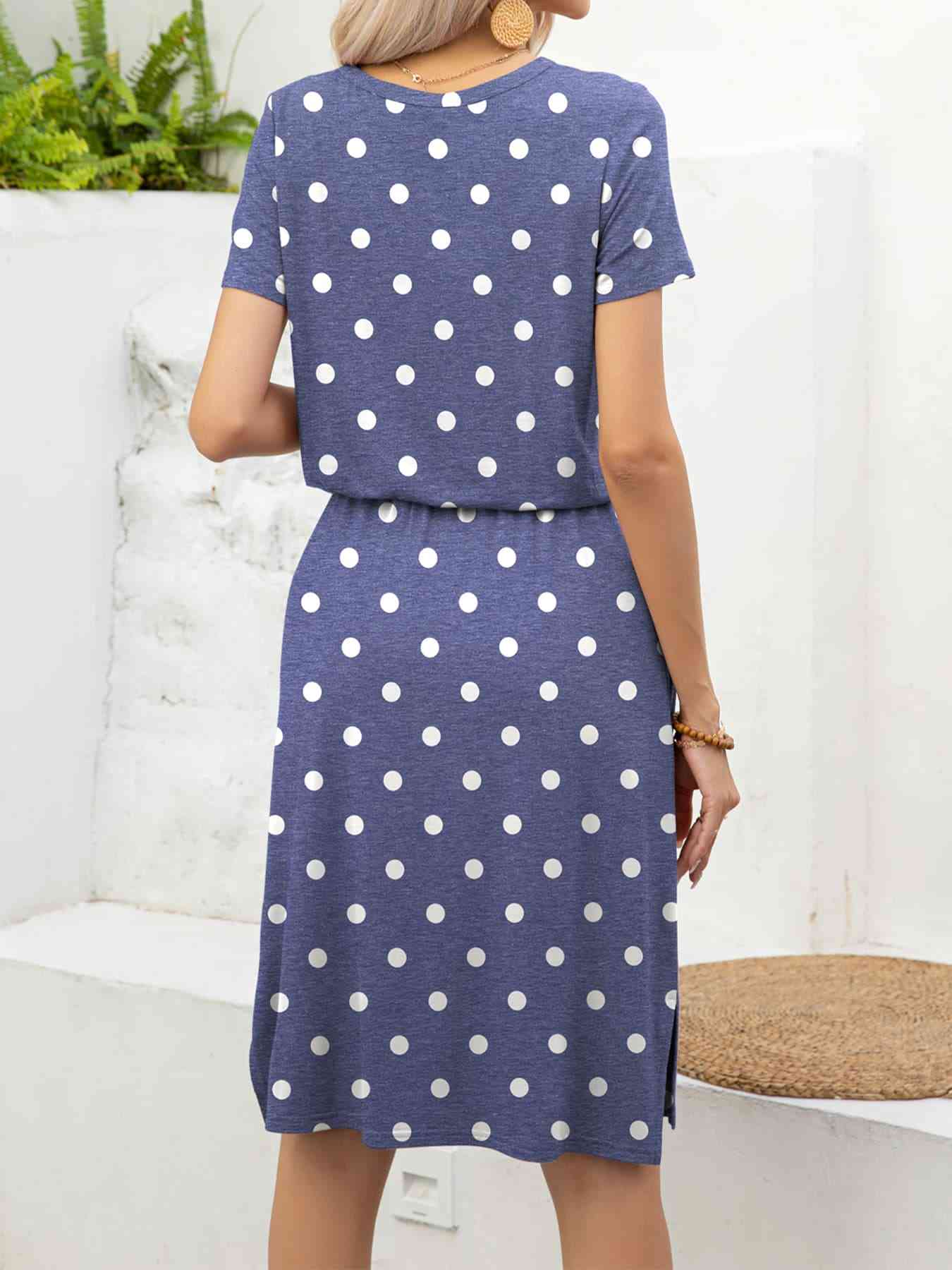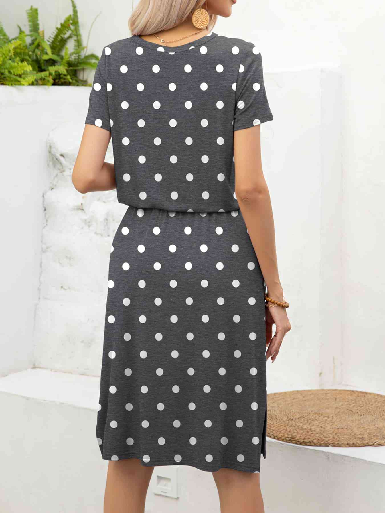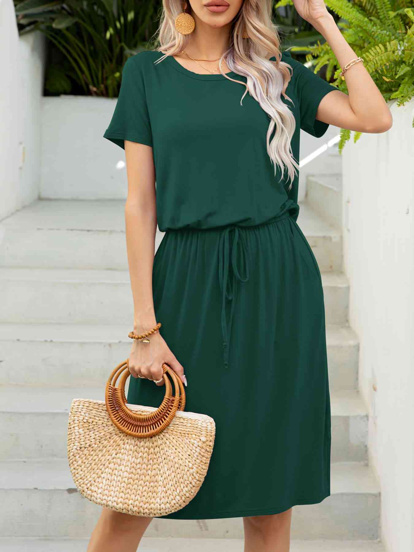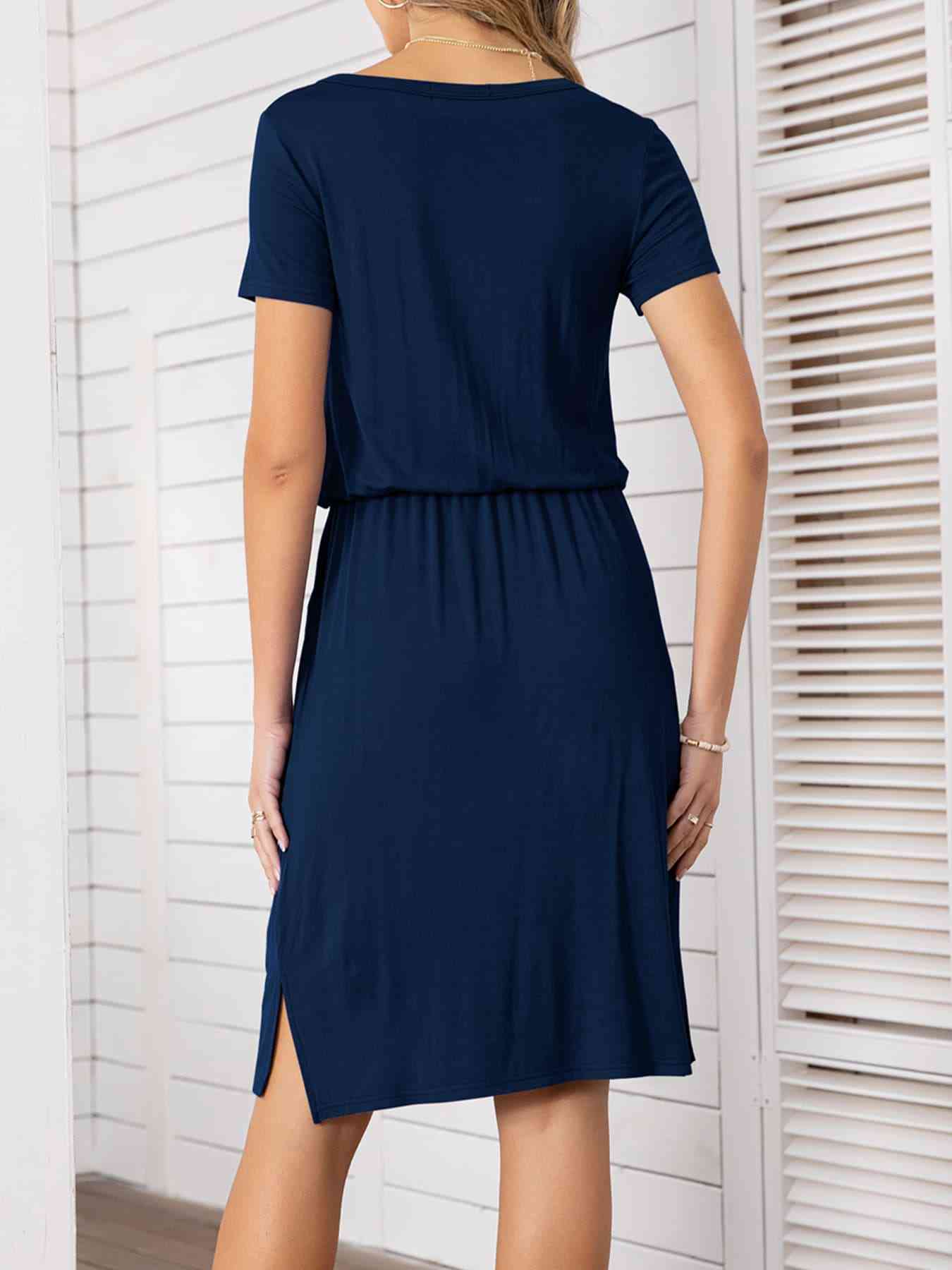 Round Neck Short Sleeve Slit Dress with Pockets