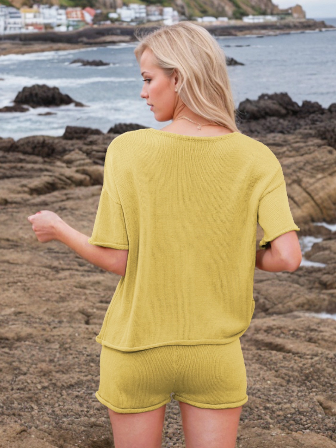 Round Neck Short Sleeve Top and Shorts Sweater Set