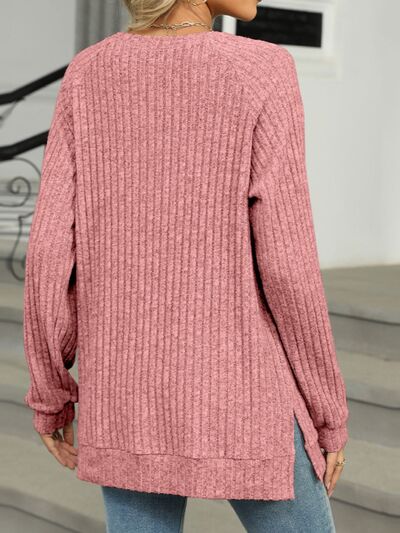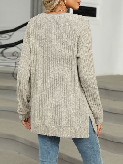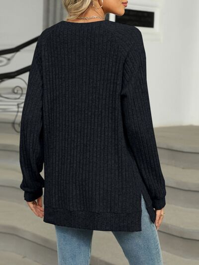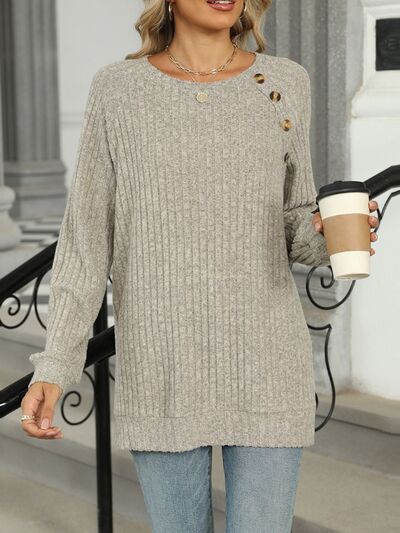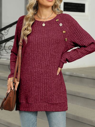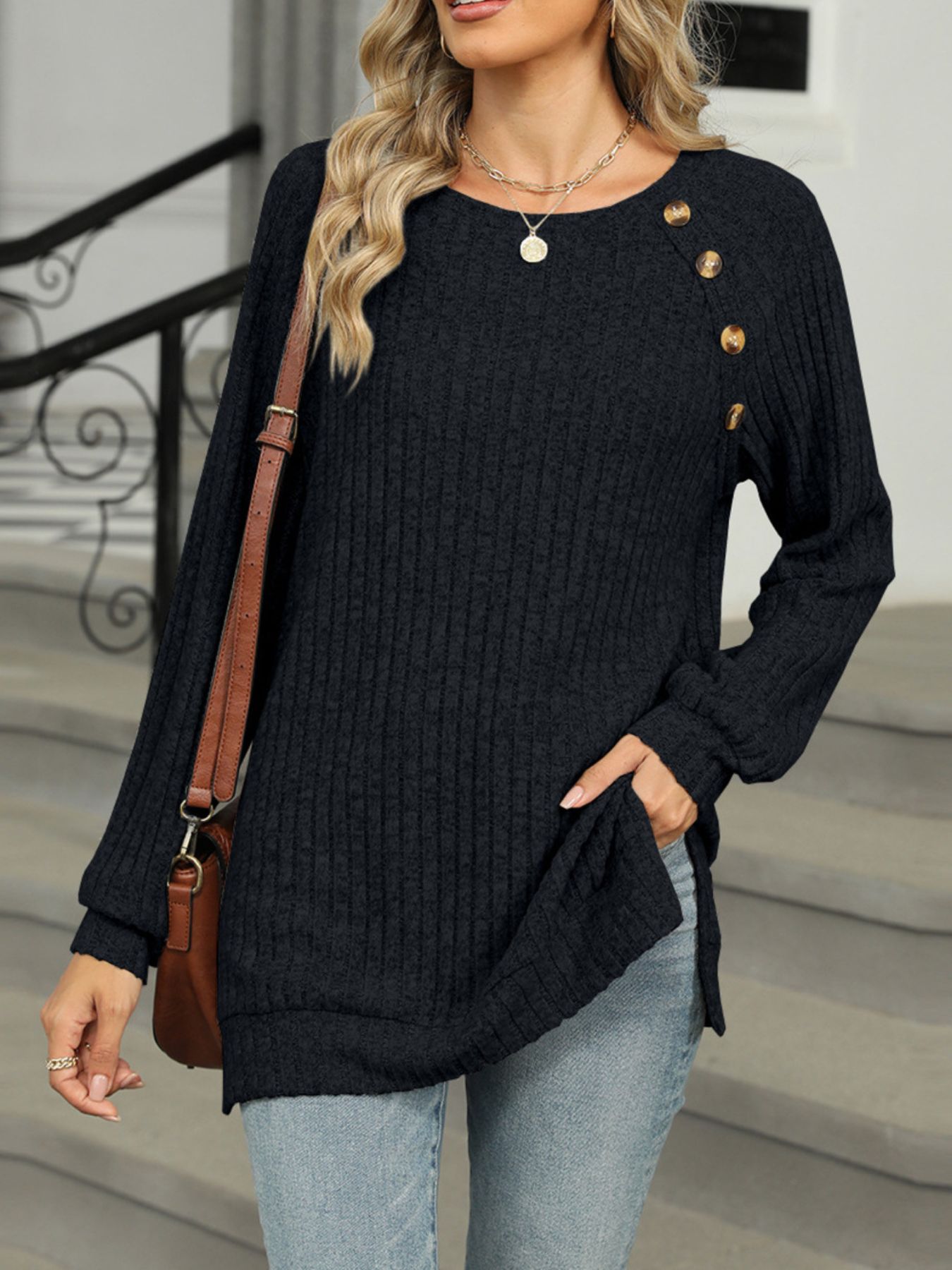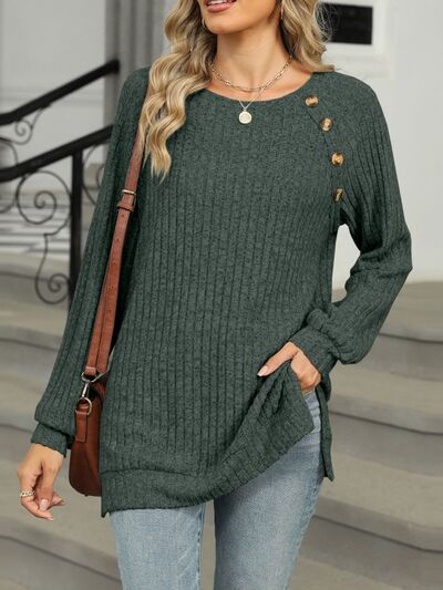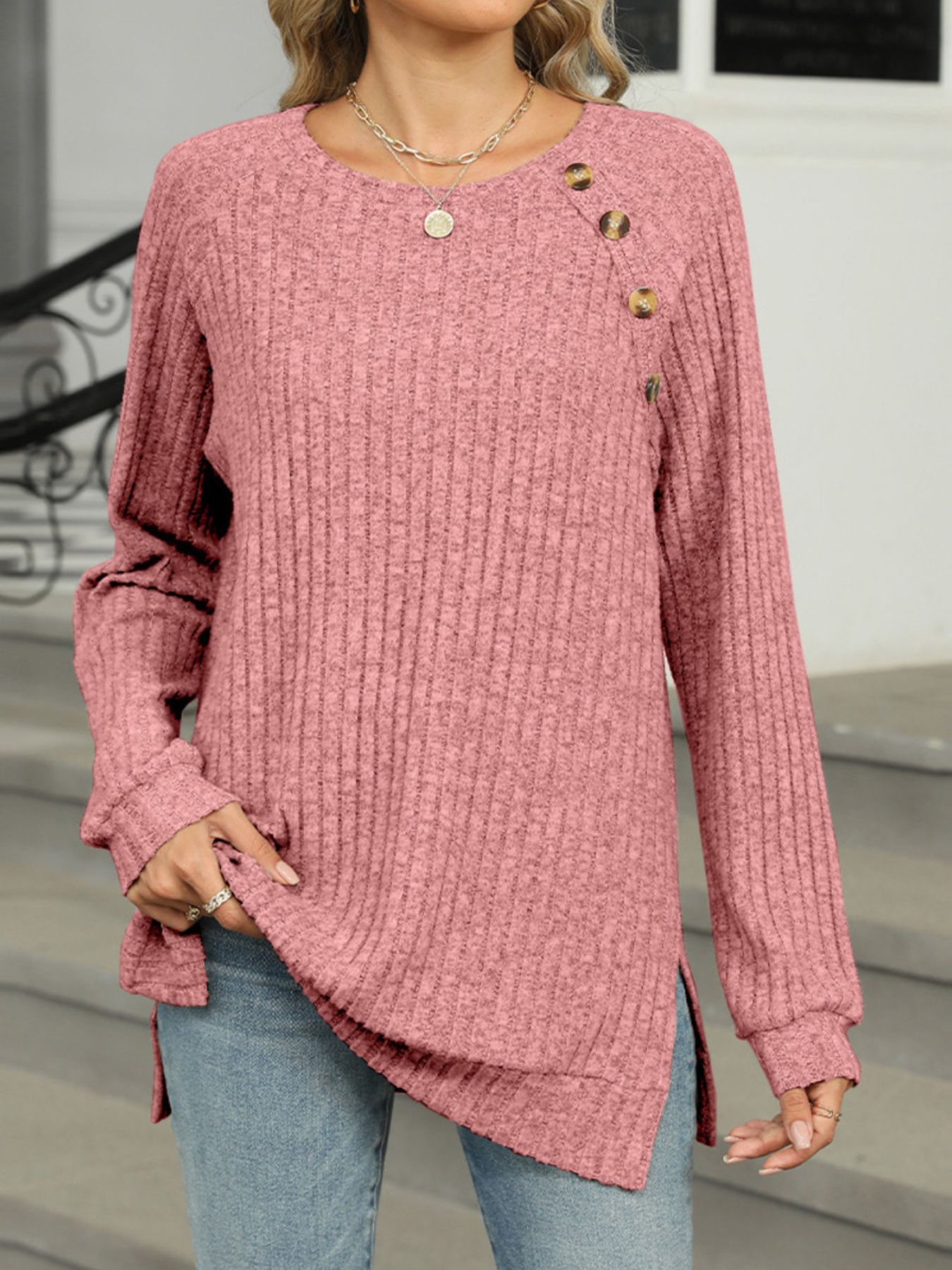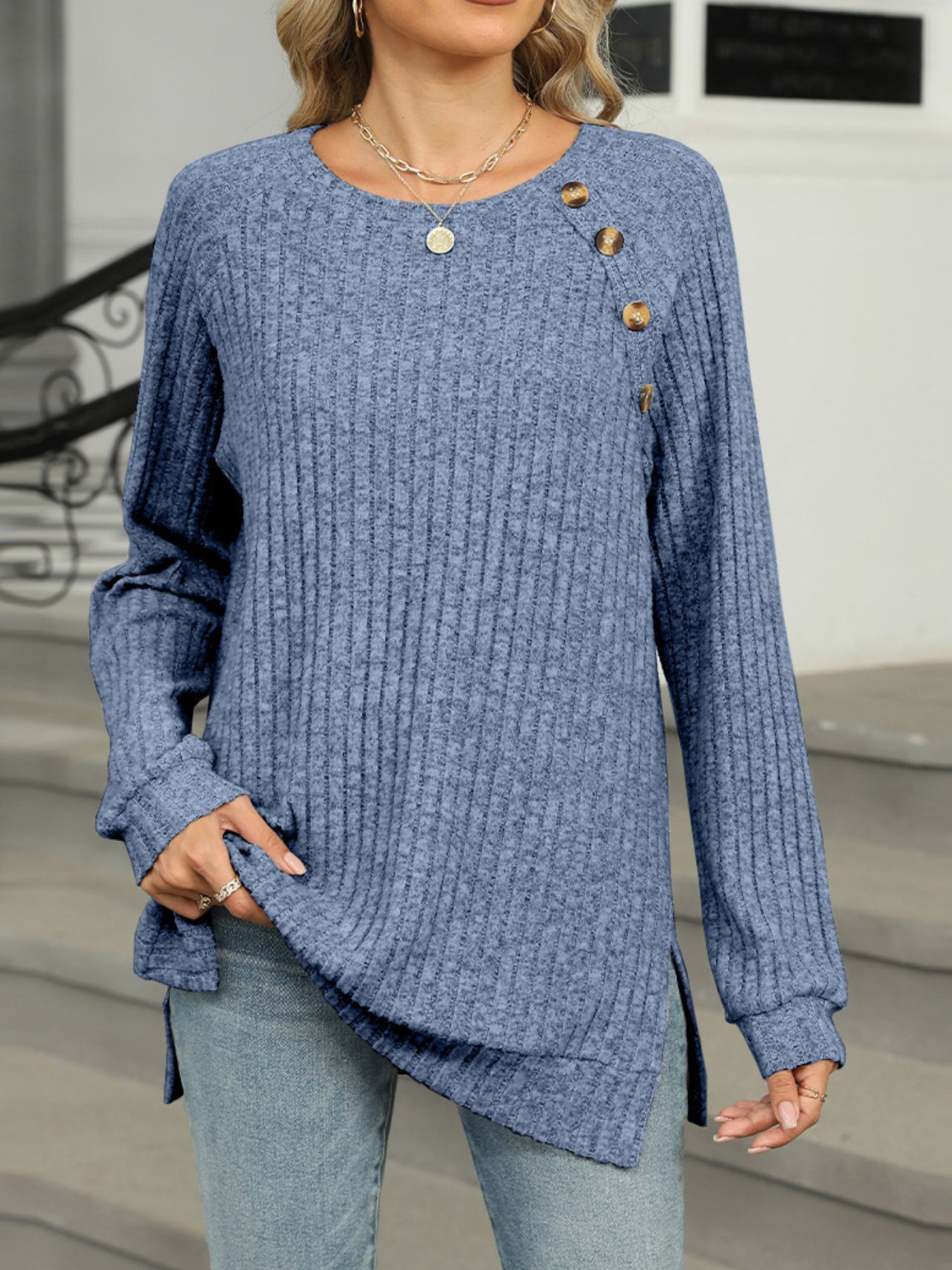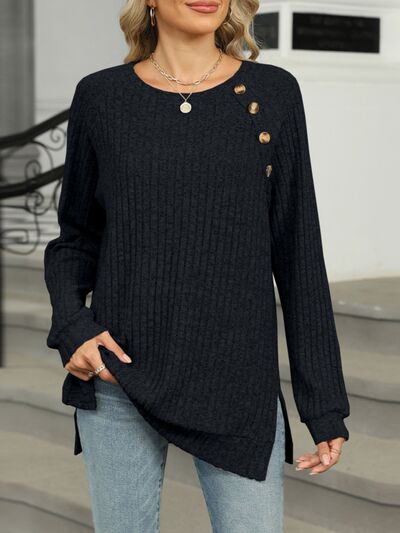 Round Neck Side Slit Ribbed Knit Top with Asymmetric Button Detail