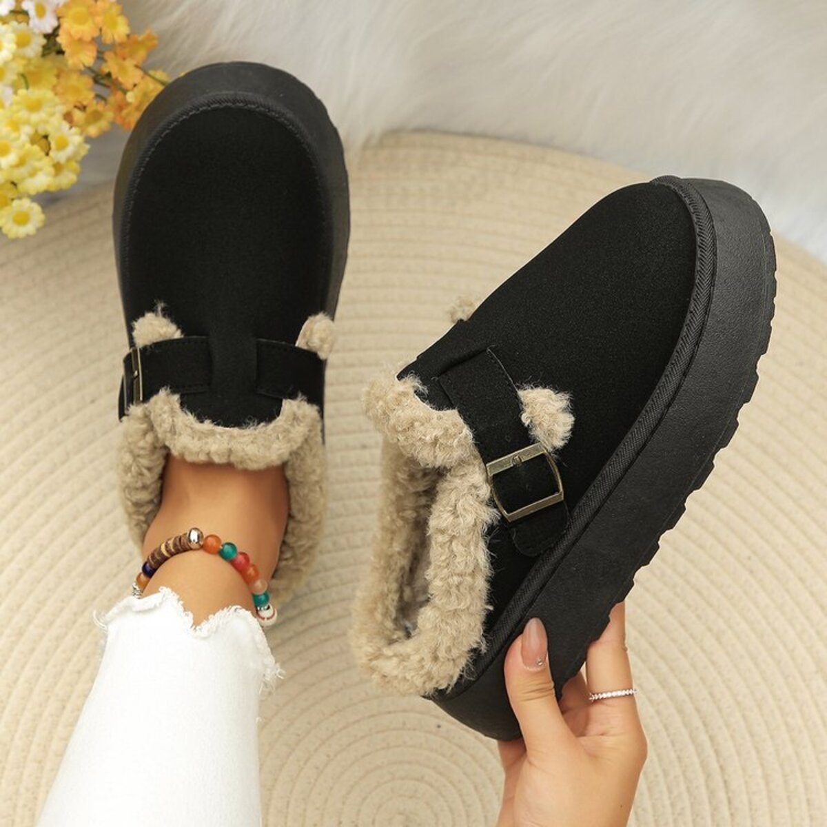 Round Toe Platform Fleece-Lined Slip-Ons
