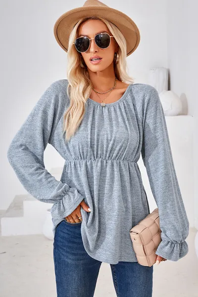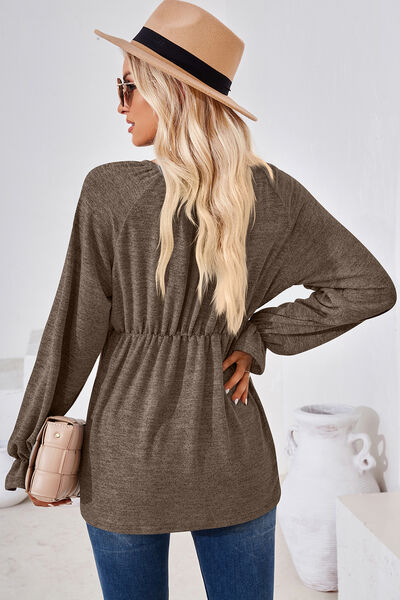 Ruched Round Neck Flounce Sleeve Blouse