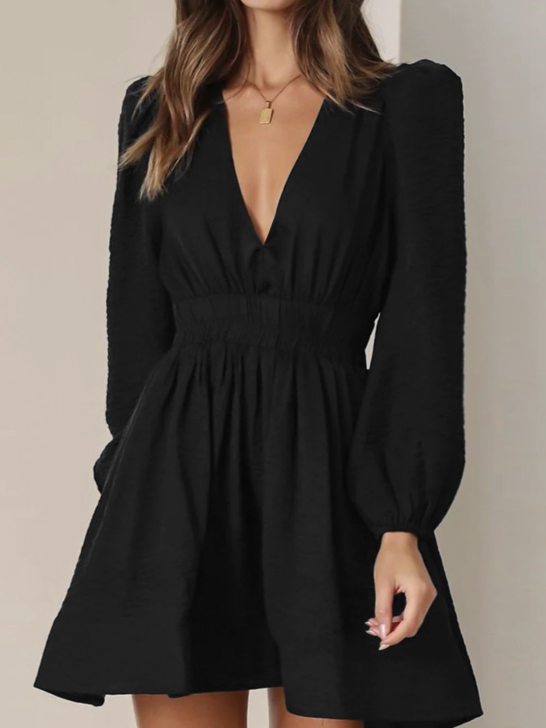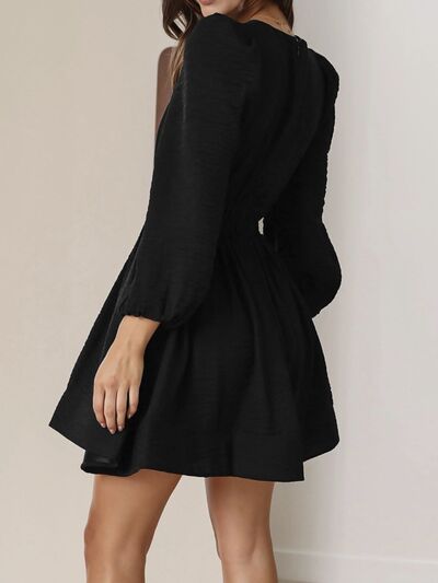 Ruched V-Neck Balloon Sleeve Mini Dress