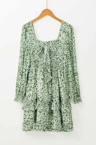 Ruffle Hem Floral Square Neck Long Sleeve Dress