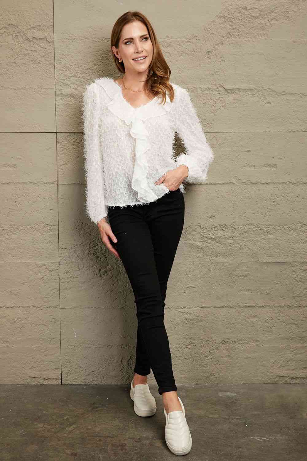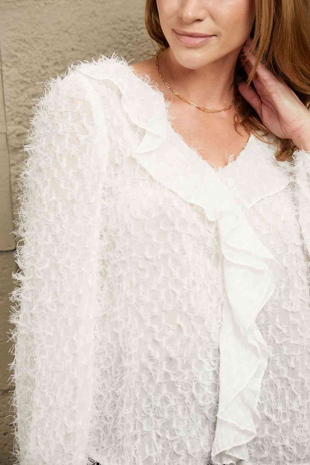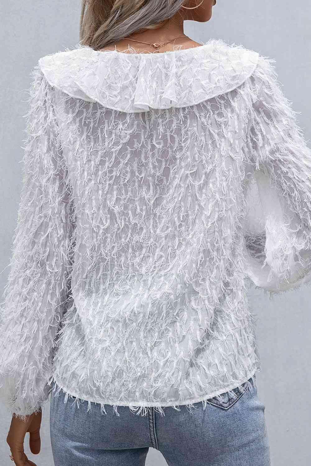 Ruffle Hem Fringe V-Neck Balloon Sleeve Blouse