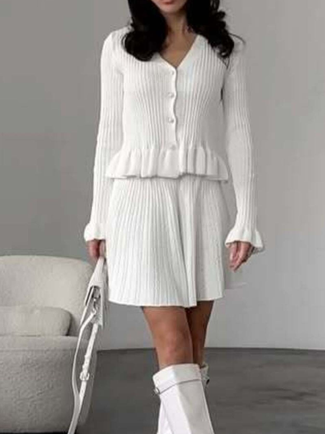 Ruffle Trim Knit Cardigan & Skirt Set