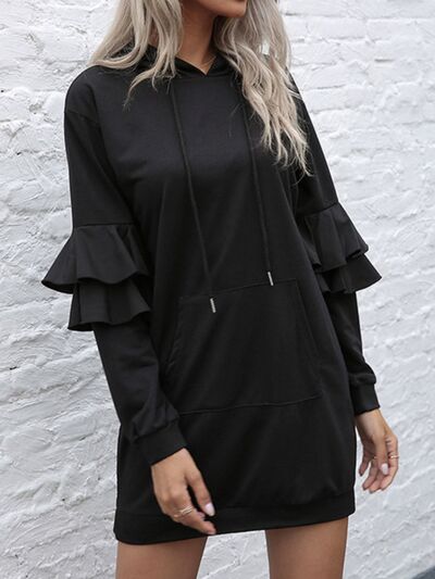 Ruffled Drawstring Long Sleeve Hooded Dress