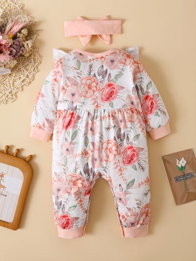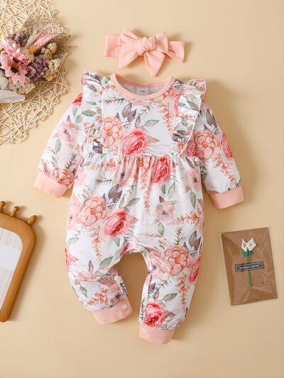 Ruffled Floral Round Neck Jumpsuit with Headband