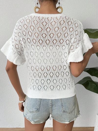 Ruffled Openwork Round Neck Knit Top