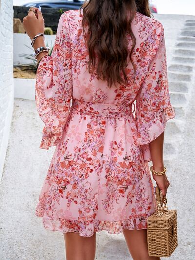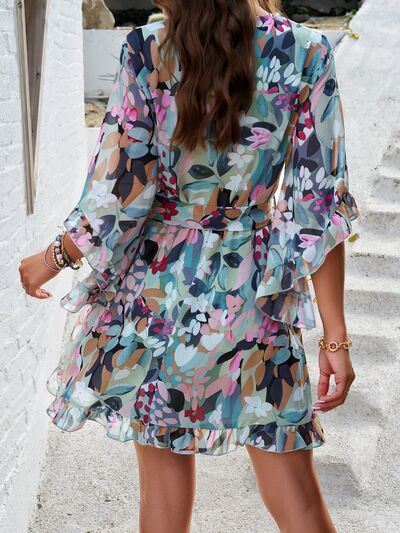 Ruffled Printed Surplice Half Sleeve Mini Dress