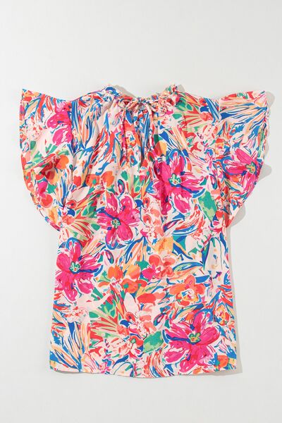 Ruffled Printed Tie Neck Cap Sleeve Blouse