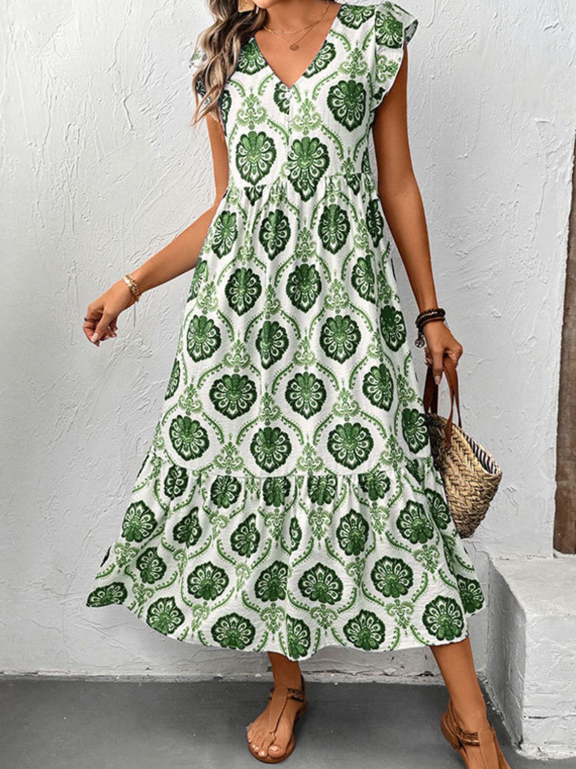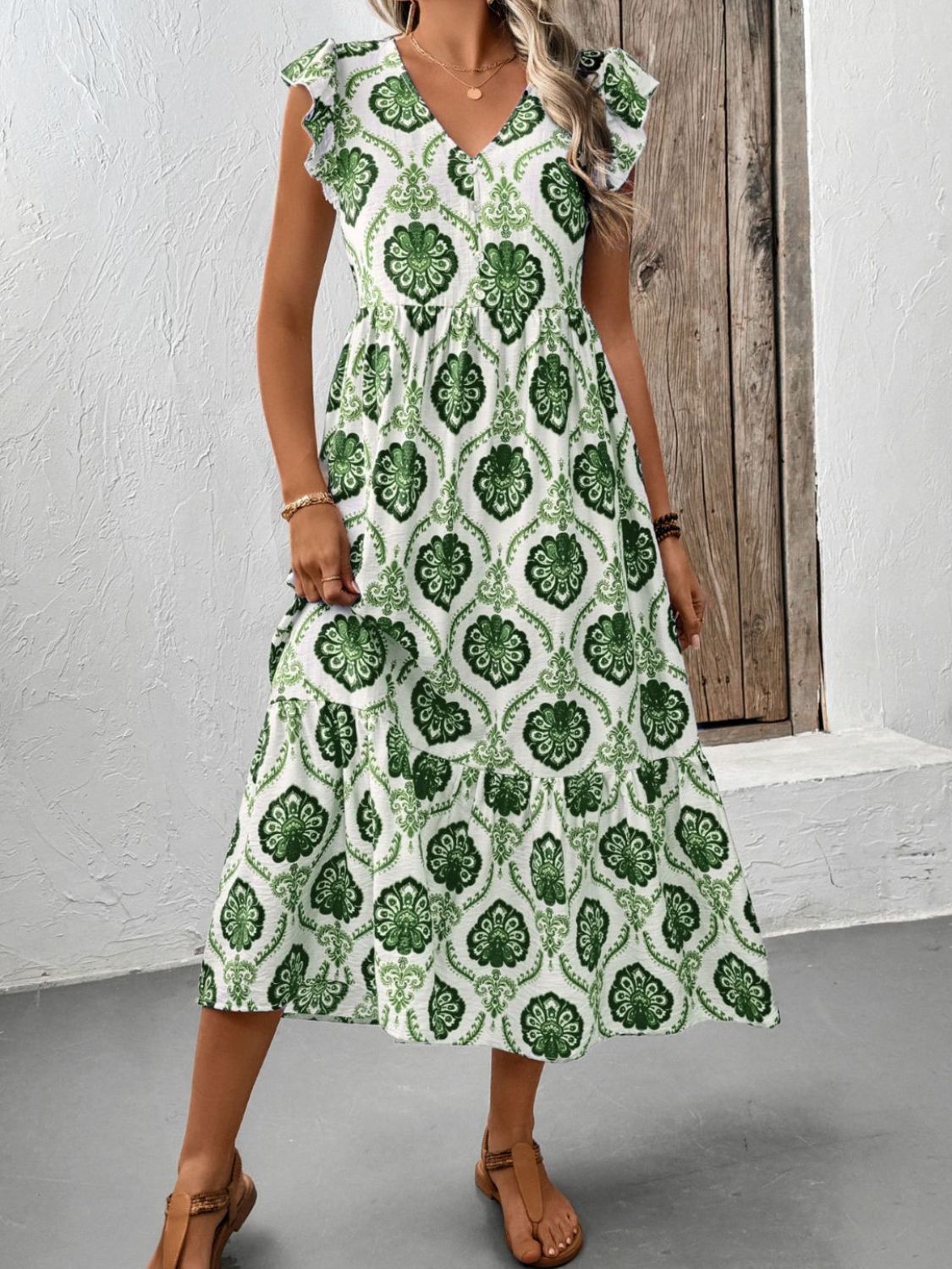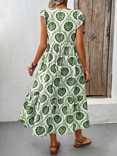 Ruffled Printed V-Neck Cap Sleeve Dress