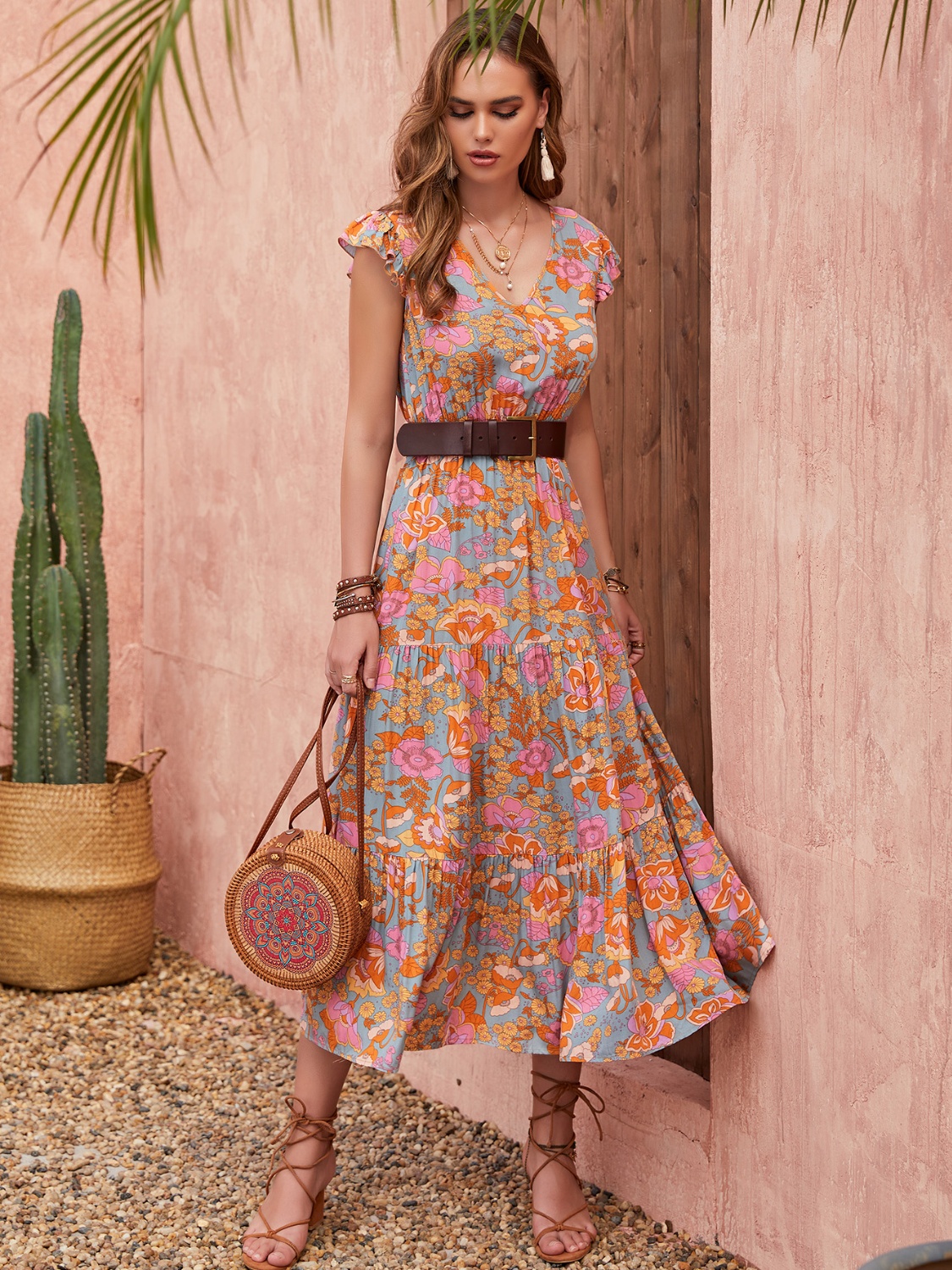 Ruffled Printed V-Neck Cap Sleeve Tiered Dress