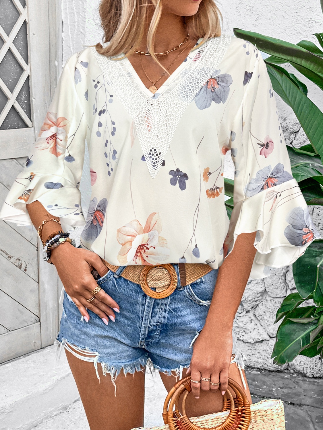 Ruffled Printed V-Neck Half Sleeve Blouse
