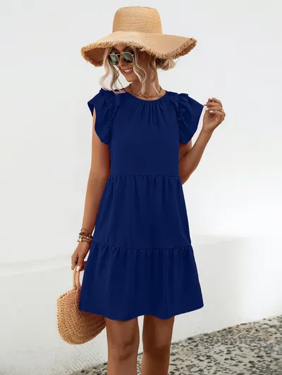 Ruffled Round Neck Cap Sleeve Mini Dress