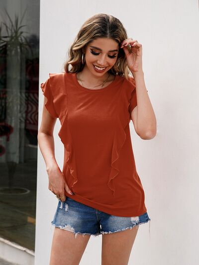 Ruffled Round Neck Cap Sleeve T-Shirt