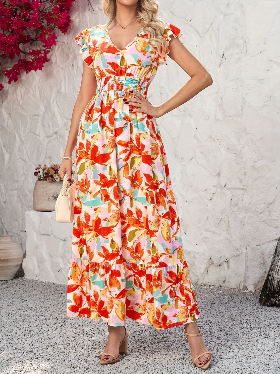 Ruffled V-Neck Cap Sleeve Dress