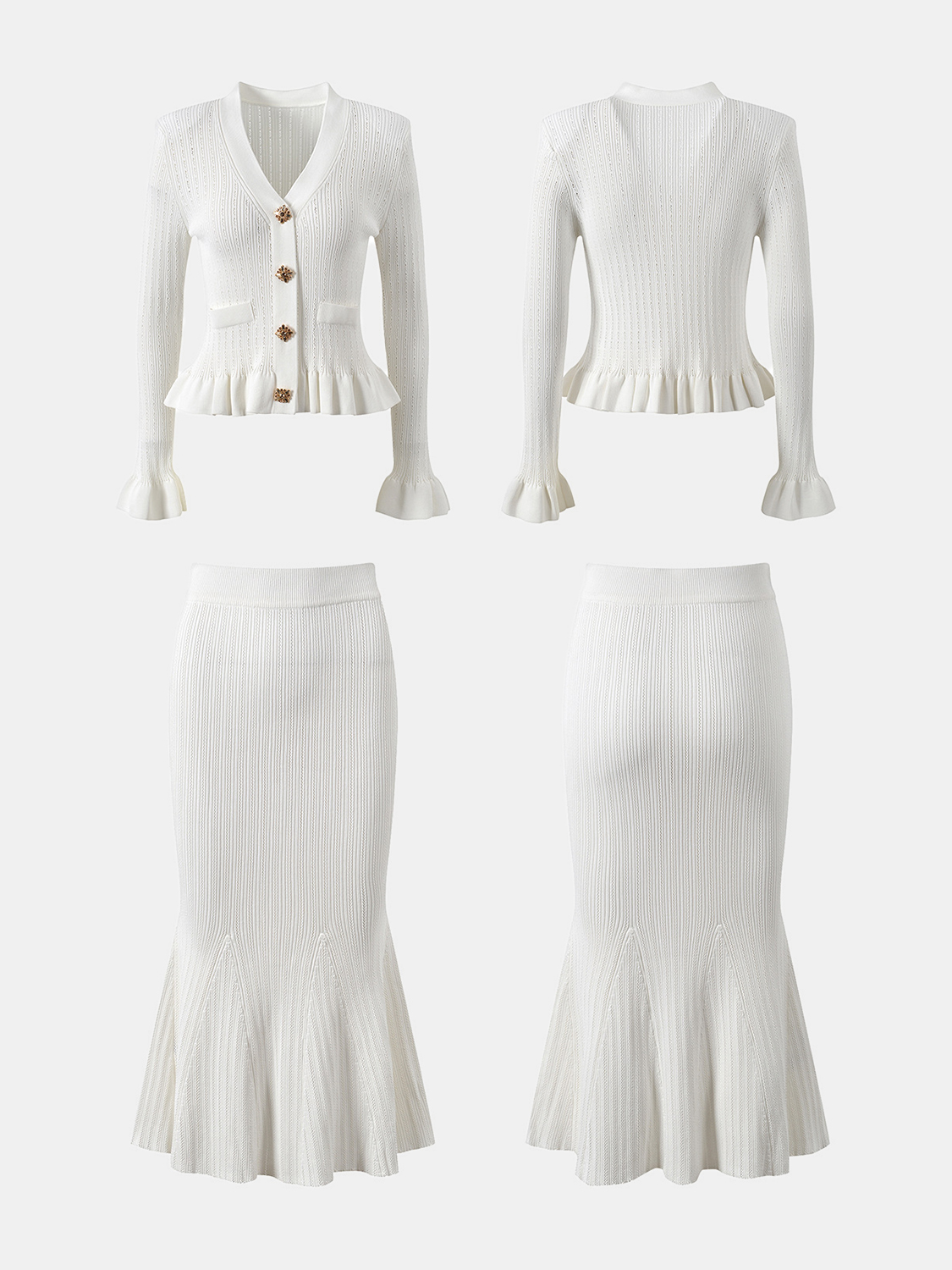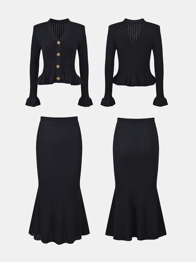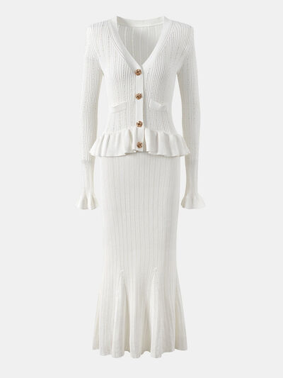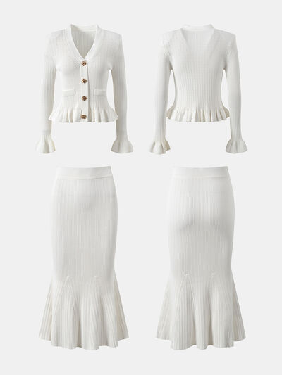 Ruffled V-Neck Top and Midi Skirt Sweater Set