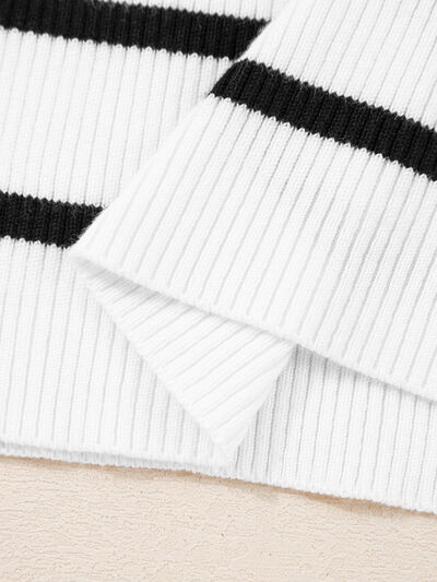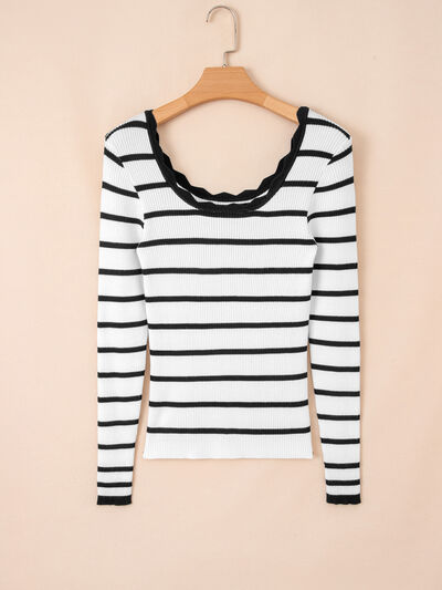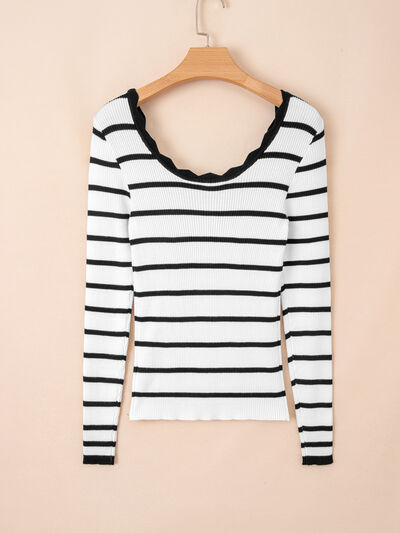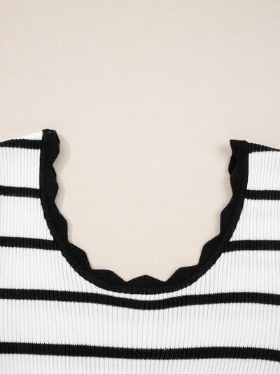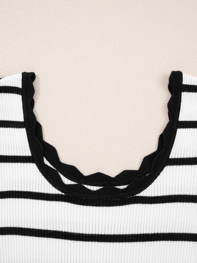 Scalloped Trim U Neck Striped Ribbed Slim Knit Top