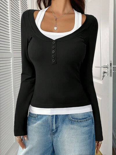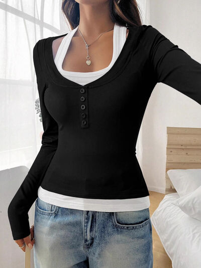 Scoop Neck Long Sleeve Fake Two-Piece T-Shirt