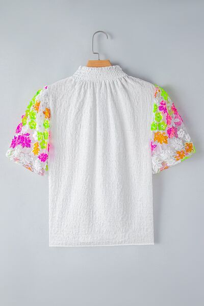 Sequin Flower Mock Neck Half Sleeve Blouse