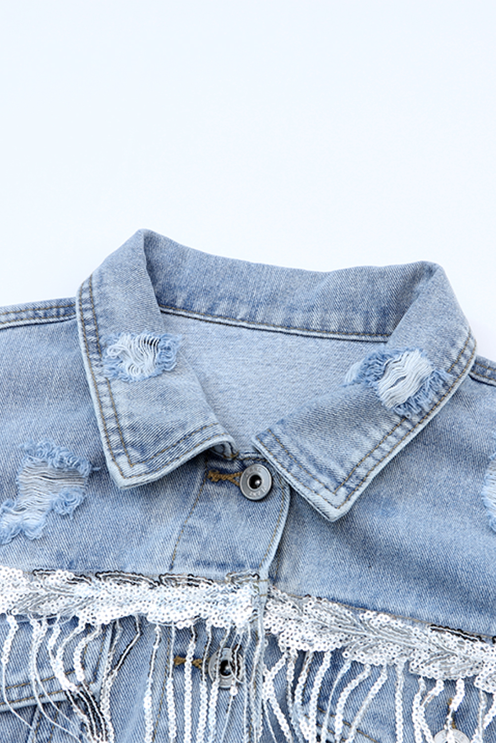Sequin Fringe Trim Distressed Button Up Denim Jacket