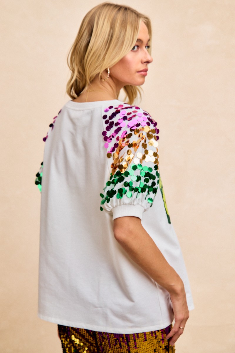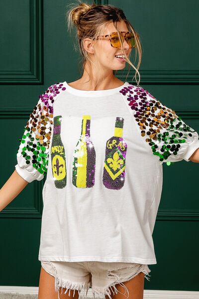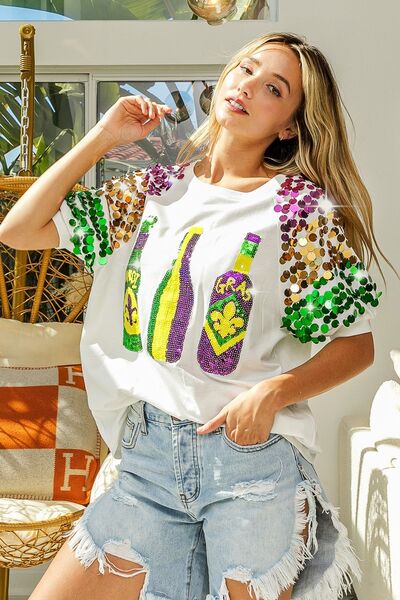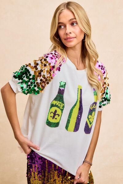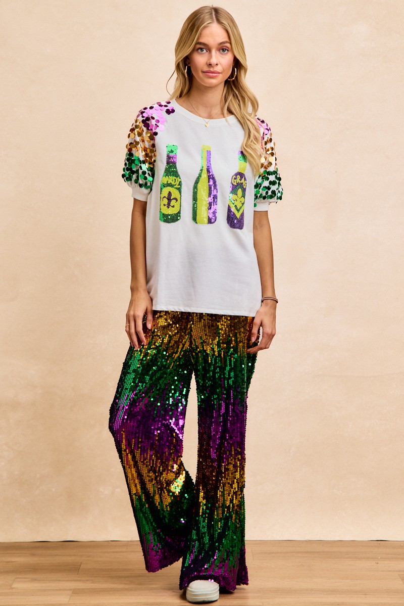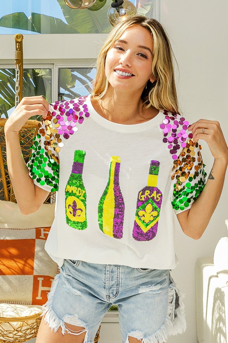 Sequin Mardi Gras Bottles Spangled Sleeve Top