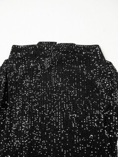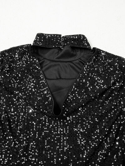 Sequin Mock Neck Drape Open Back Bell Sleeve Top