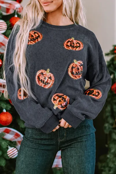 Sequin Patch Pumpkin Round Neck Sweatshirt