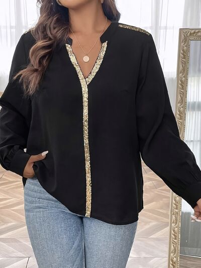 Sequin Trim Notched Long Sleeve Blouse