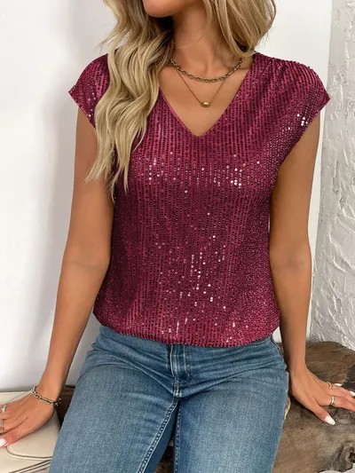 Sequin V-Neck Cap Sleeve Top