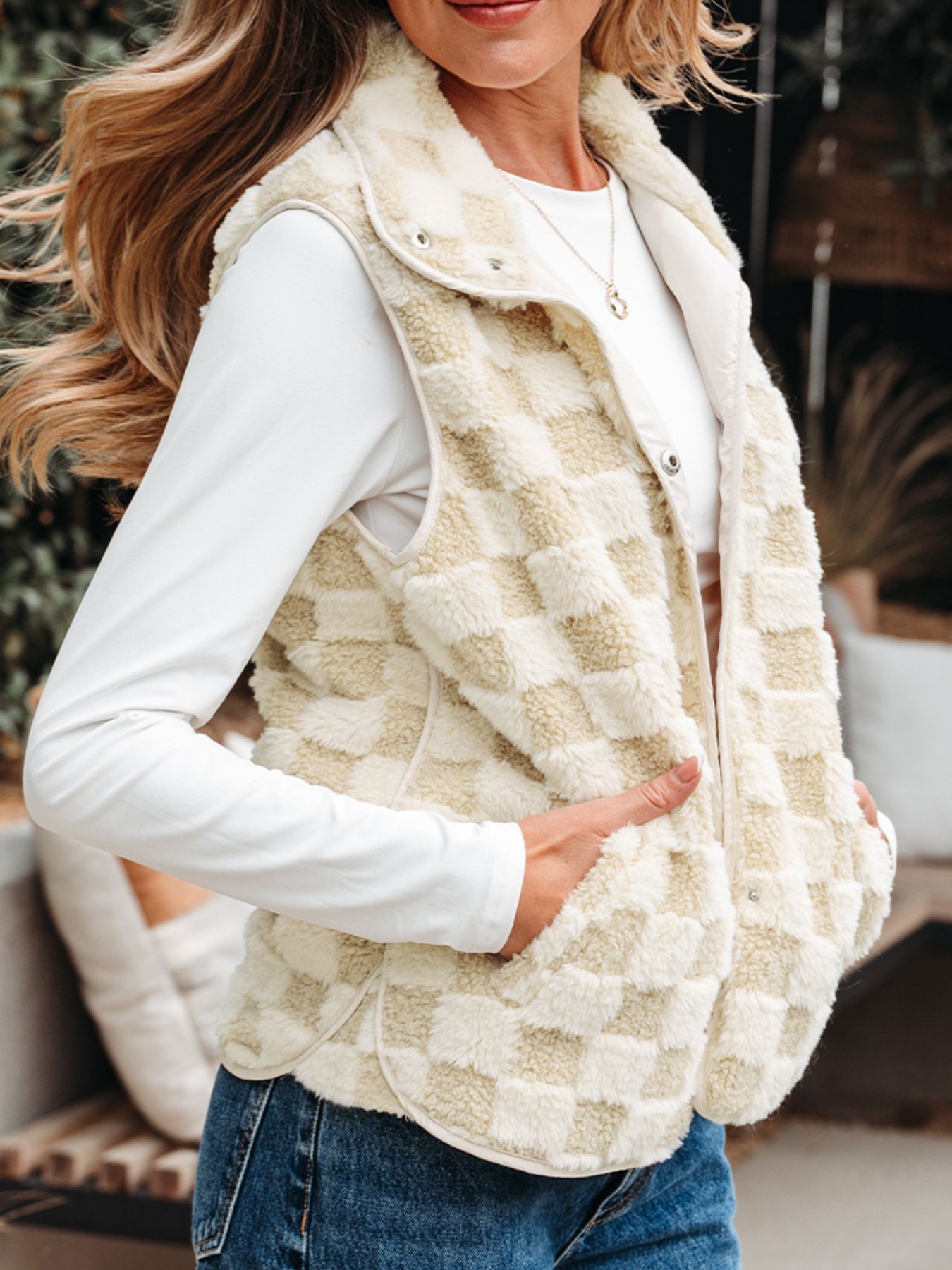 Sherpa Checkerboard Snap Button Vest Coat with Pocket