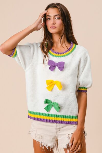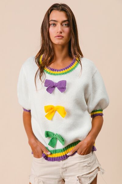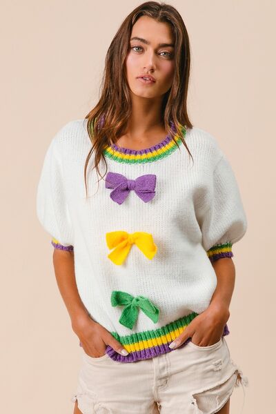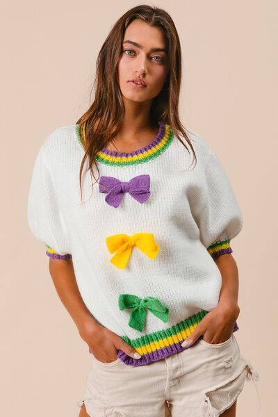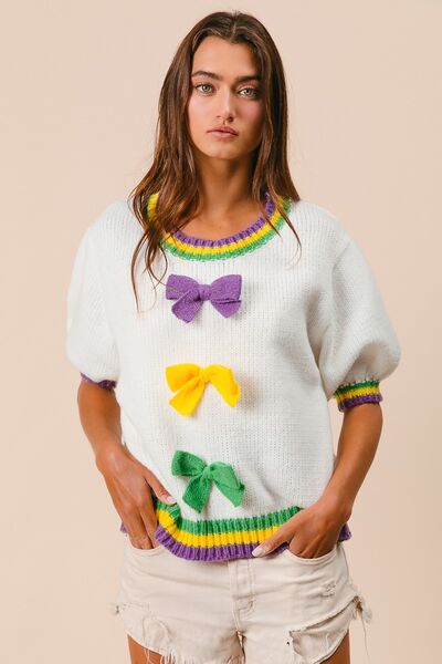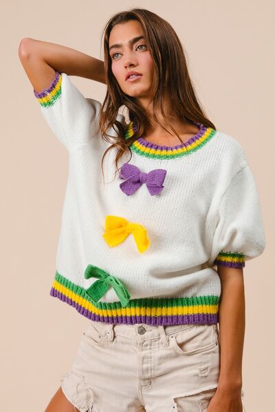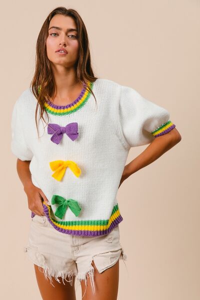 Short Puff Sleeve Ribbon Bow Mardi Gras Sweater
