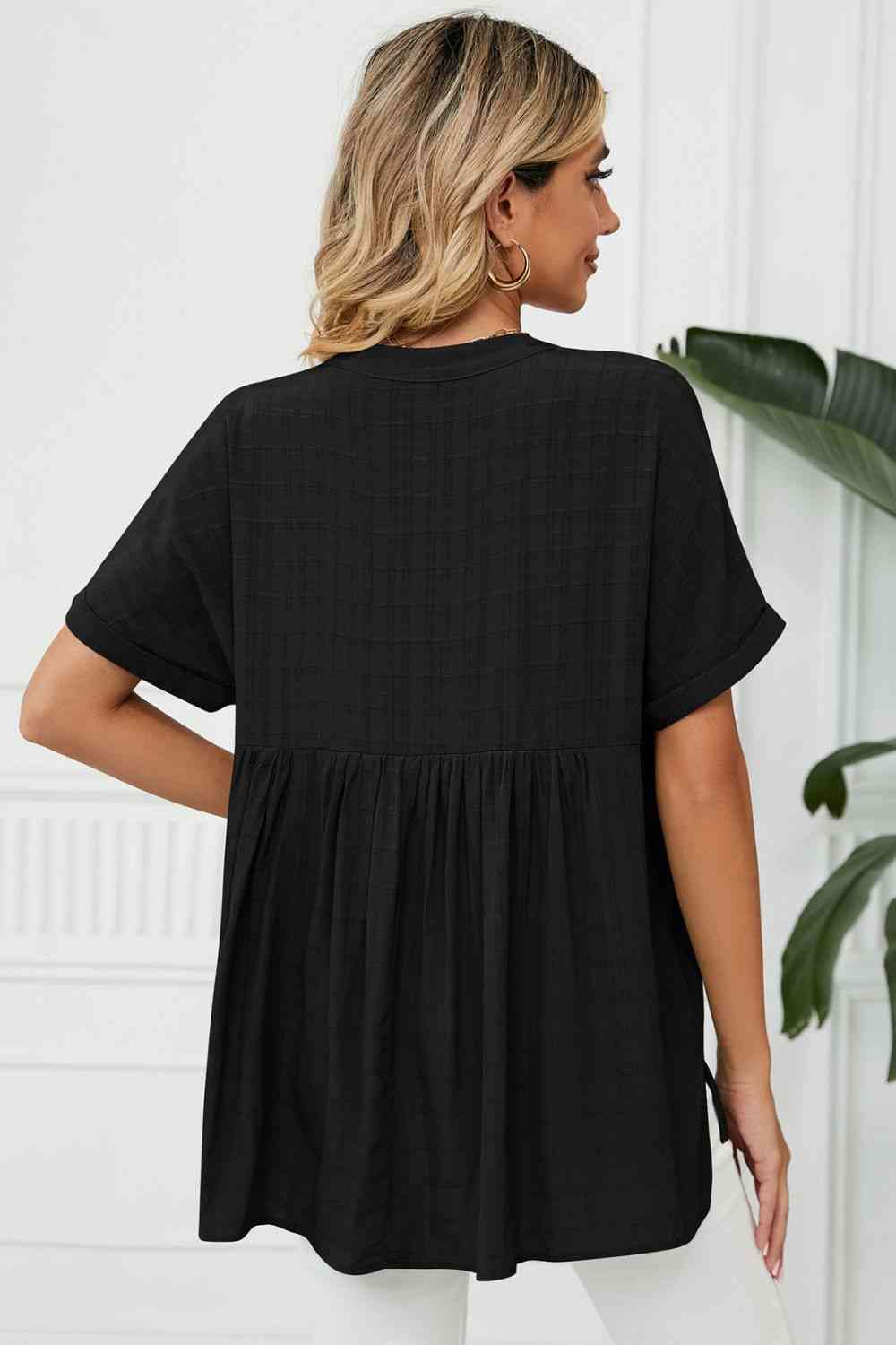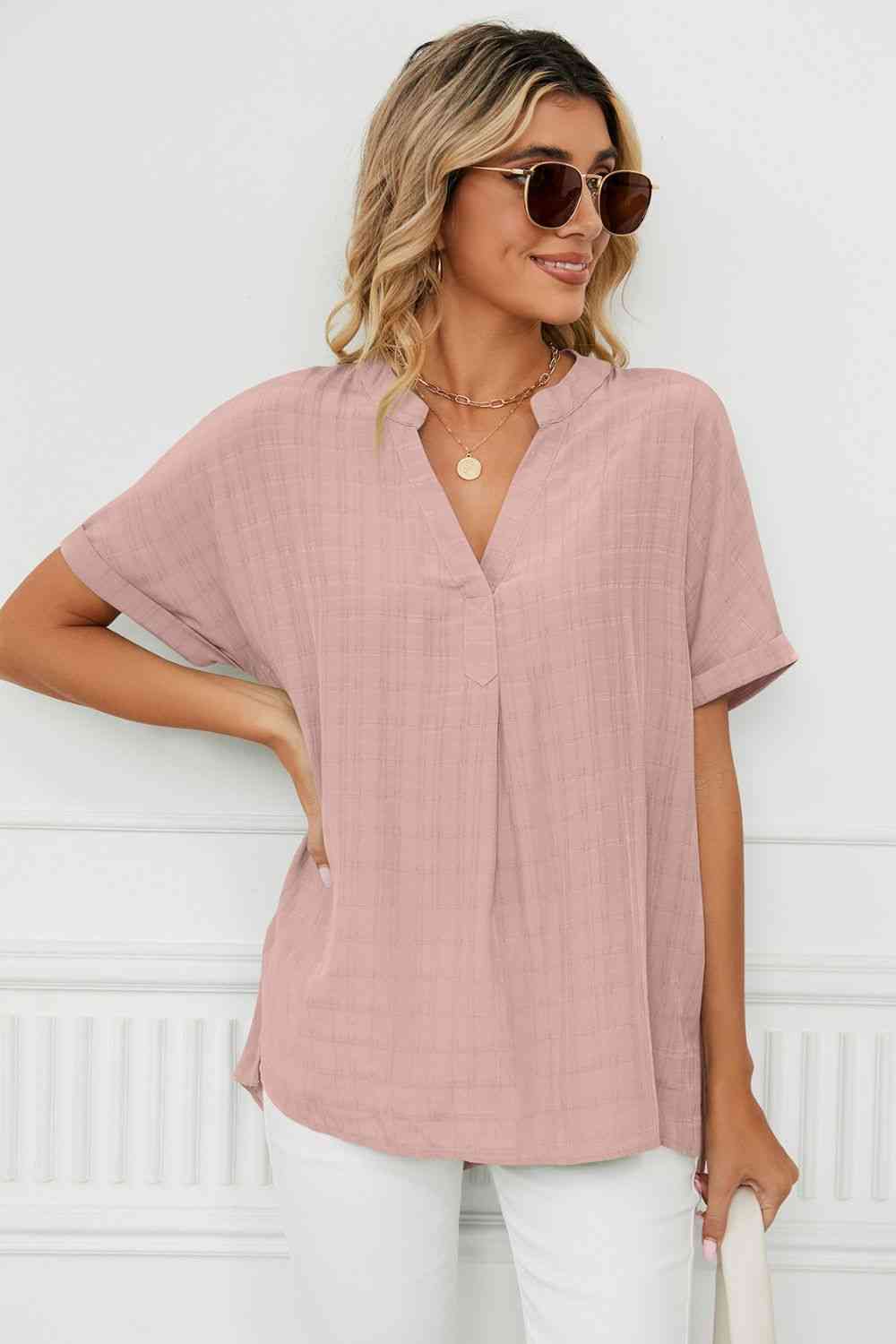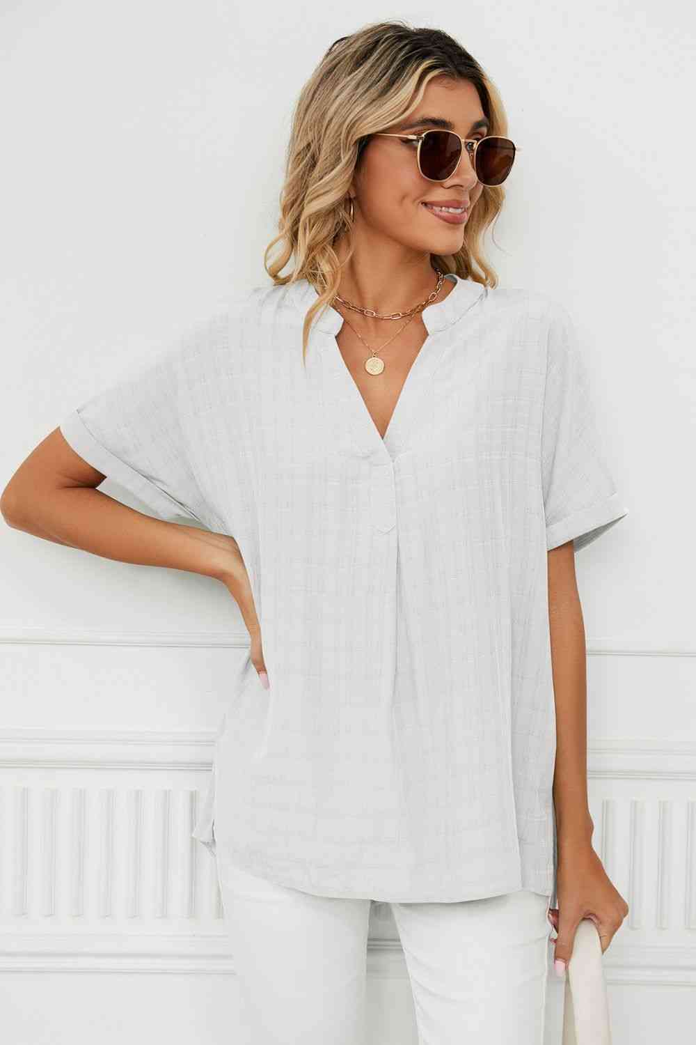 Side Slit Notched Neck Cuffed Short Sleeve Blouse