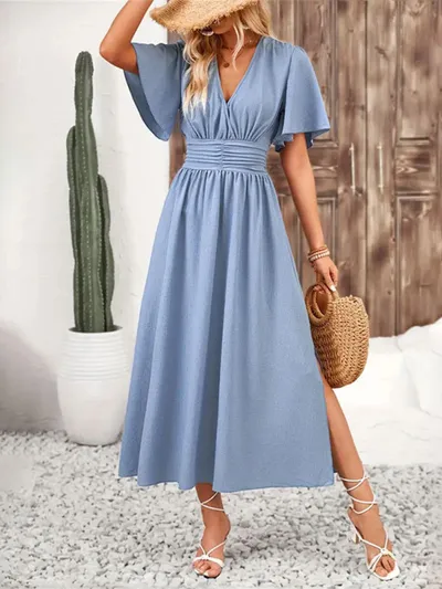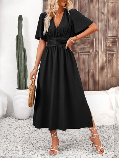Side Slit Surplice Flutter Sleeve Midi Dress
