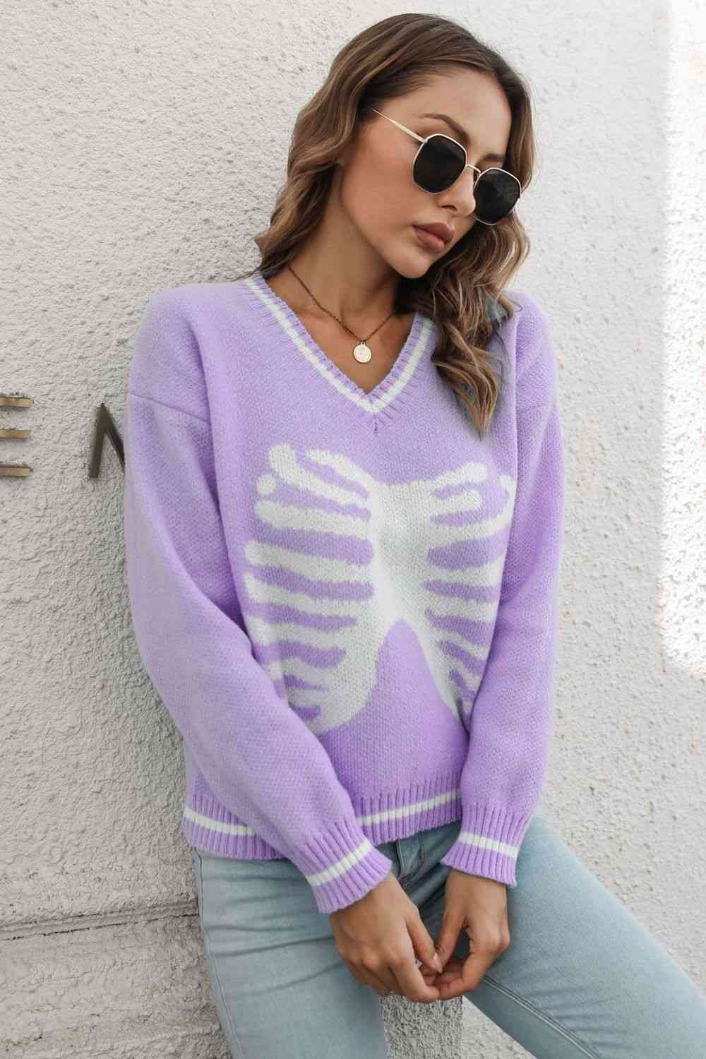Skeleton Pattern V-Neck Long Sleeve Pullover Sweater