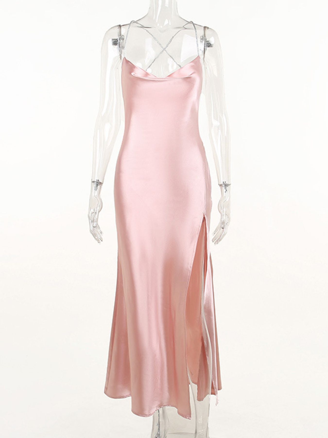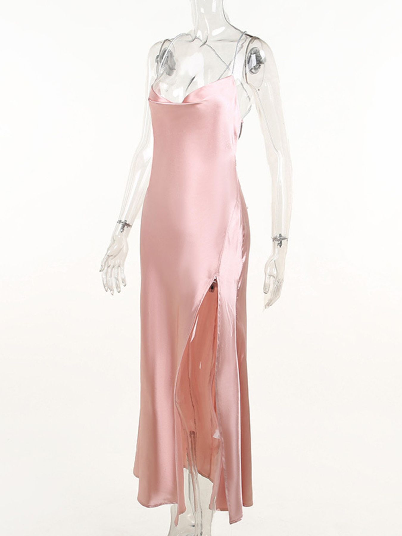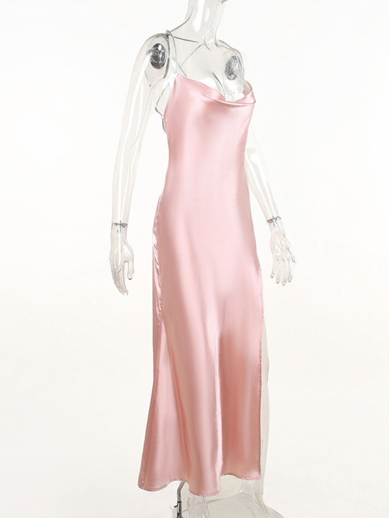 Slinky Satin Cowl Neck High Slit Dress with Back Lace Up