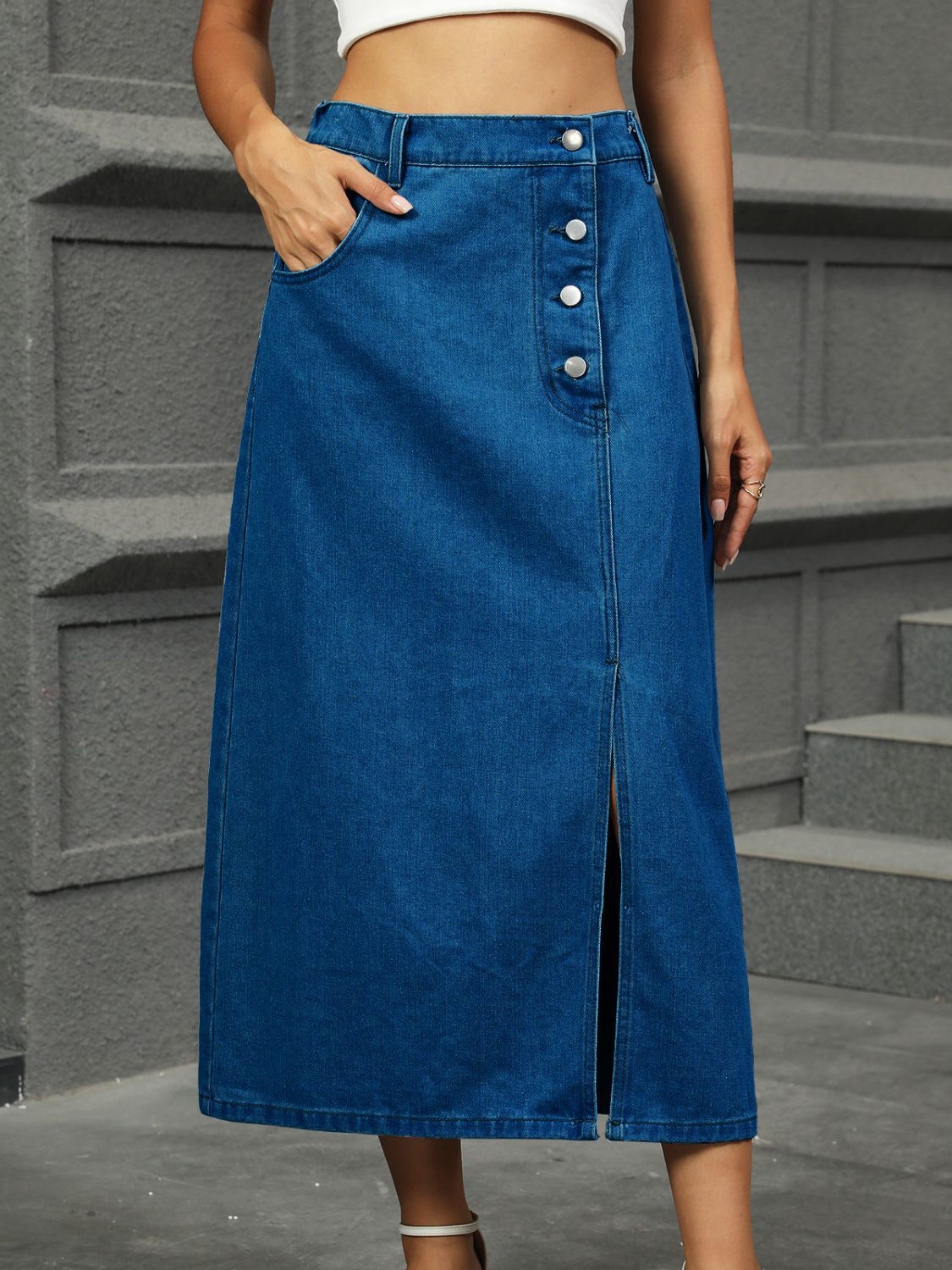 Slit Button Detail Denim Midi Skirt