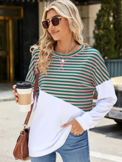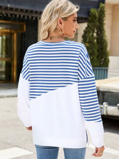 Slit Contrast Striped Long Sleeve Sweatshirt