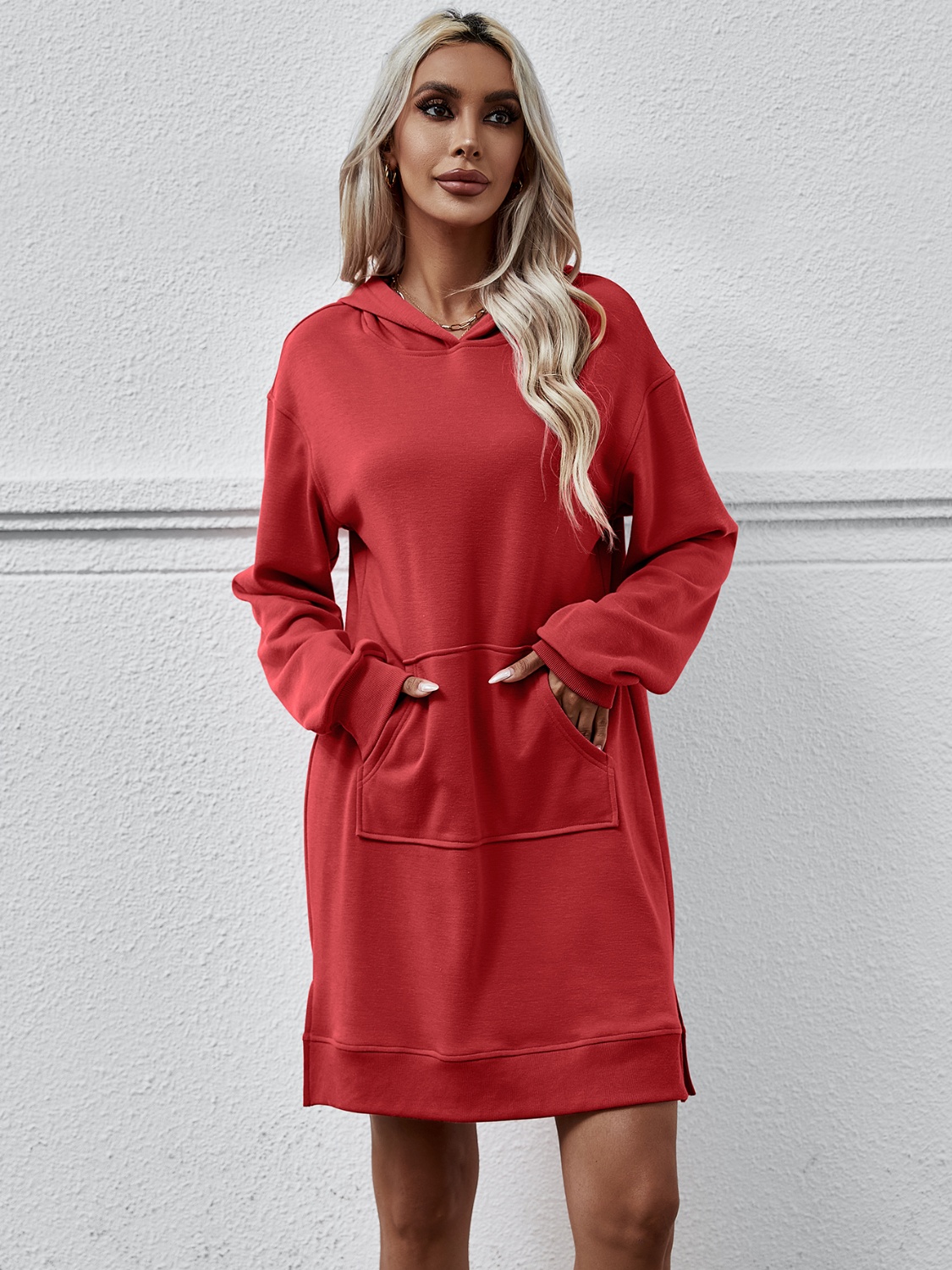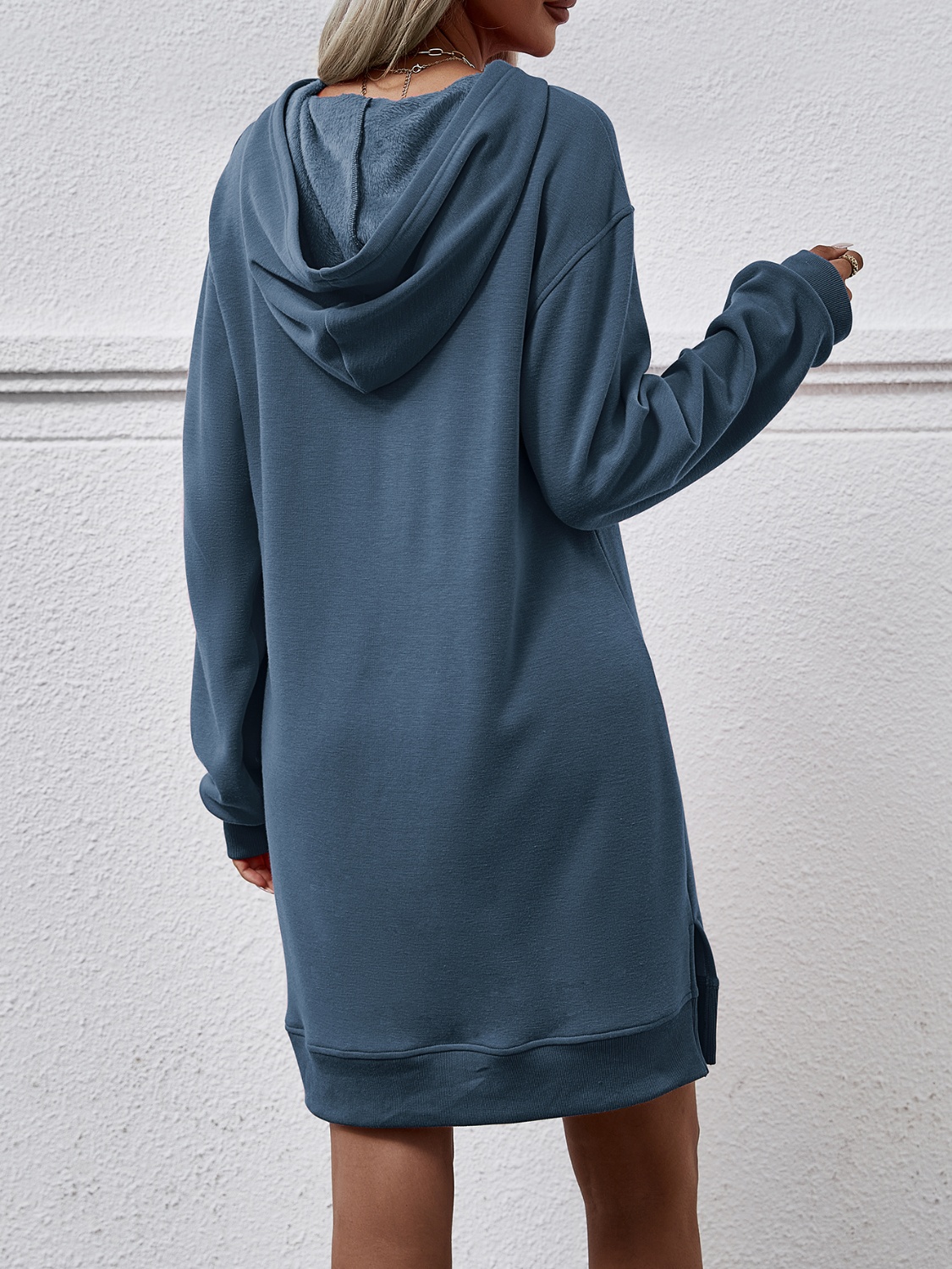 Slit Long Sleeve Hooded Dress with Pocket