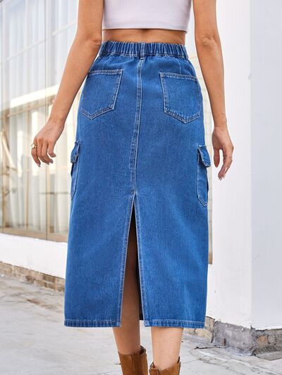 Slit Midi Denim Skirt with Pockets
