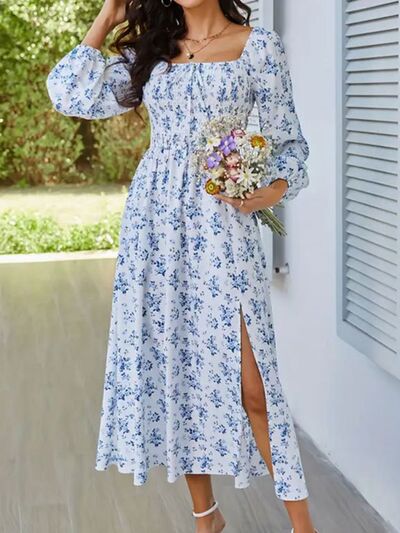 Slit Smocked Floral Square Neck Balloon Sleeve Midi Dress